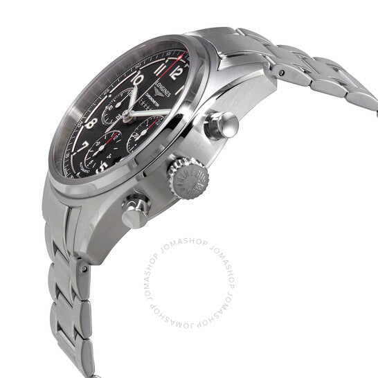 علبة من الفولاذ المقاوم للصدأ مع سوار من الفولاذ المقاوم للصدأ. إطار ثابت من الفولاذ المقاوم للصدأ. ميناء أسود بعقارب فضية مضيئة وعلامات ساعات بأرقام عربية. علامات دقائق بأرقام عربية (بفاصل ٥ دقائق). علامات دقائق حول الحافة الخارجية. عقارب وعلامات مضيئة. عرض التاريخ بين موضعي الساعة ٤ و٥. كرونوغراف - ثلاثة أقراص فرعية تعرض: ٦٠ ثانية، ٣٠ دقيقة، و١٢ ساعة. حركة أوتوماتيكية من عيار L688.4. زجاج من الياقوت المقاوم للخدش والانعكاس. تاج لولبي. غطاء خلفي صلب. شكل دائري. حجم العلبة: ٤٢ مم. سمكها: ١٦.٣ مم. عرض السوار: ٢٢ مم. مشبك قابل للطي بزر ضغط. مقاومة للماء حتى عمق ١٠٠ متر. الوظائف: كرونوغراف، تاريخ، ساعة، دقيقة، ثانية. سلسلة سبيريت. تصميم كاجوال. ساعة لونجين سبيريت كرونوغراف أوتوماتيكية بمينا سوداء L3.820.4.53.6.