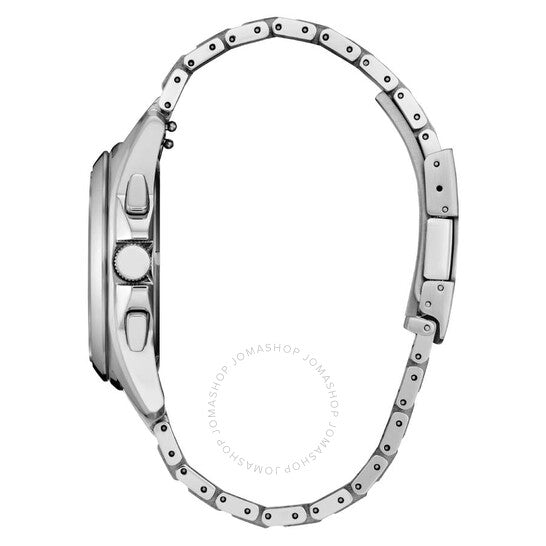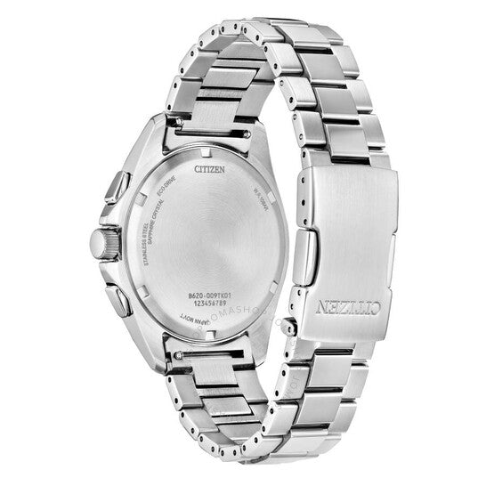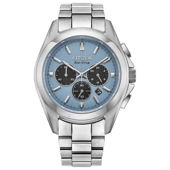 علبة وسوار من الفولاذ المقاوم للصدأ فضي اللون. إطار ثابت من الفولاذ المقاوم للصدأ فضي اللون. ميناء أزرق فاتح بعقارب وعلامات ساعات فضية اللون. علامات دقائق حول الحافة الخارجية. نوع الميناء: تناظري. عقارب مضيئة. عرض التاريخ بين موضعي الساعة 4 و5. كرونوغراف - ثلاثة أقراص فرعية تعرض: 60 ثانية، 60 دقيقة، و24 ساعة. حركة Citizen Caliber Eco-Drive B620 eco-drive. كريستال ياقوت مقاوم للخدش. غطاء خلفي صلب. شكل العلبة دائري، مقاسها: 40.5 مم. مشبك قابل للطي مع مفتاح أمان. مقاومة للماء حتى عمق 100 متر / 330 قدم. الوظائف: كرونوغراف، تاريخ، ساعات، دقائق، ثوانٍ، تعمل بالطاقة الشمسية. سلسلة Sport Luxury. طراز ساعة رياضية. ملصق الساعة: Japan Movt. ساعة Citizen Sport Luxury Chronograph للرجال CA4680-55L.