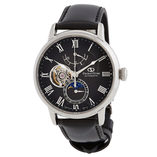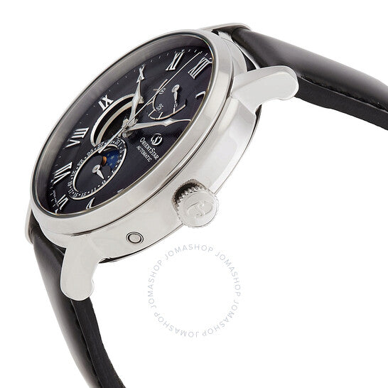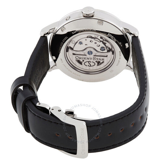 علبة فضية اللون من الفولاذ المقاوم للصدأ مع سوار جلدي أسود. إطار ثابت فضي اللون من الفولاذ المقاوم للصدأ. ميناء أسود بعقارب فضية اللون وعلامات ساعات رومانية. علامات دقائق حول الحافة الخارجية. نوع الميناء: تناظري. نافذة عرض التاريخ عند موضع الساعة السادسة. ميناءان فرعيان يعرضان: التاريخ/طور القمر ومؤشر احتياطي الطاقة. حركة أورينت أوتوماتيكية من عيار F7M62 مع احتياطي طاقة يصل إلى 50 ساعة. زجاج ياقوت مقاوم للخدش. تاج قابل للسحب/الدفع. غطاء خلفي شفاف. شكل دائري، مقاس العلبة: 41 مم، سمكها: 12 مم. مشبك قابل للطي. مقاومة للماء حتى عمق 50 مترًا / 165 قدمًا. الوظائف: التاريخ، الساعة، الدقيقة، الثانية، مؤشر احتياطي الطاقة، طور القمر. سلسلة أورينت ستار. طراز ساعة رسمية. ملصق الساعة: Japan Movt. ساعة أورينت أورينت ستار أوتوماتيكية للرجال بمينا أسود RE-AY0107N00B.