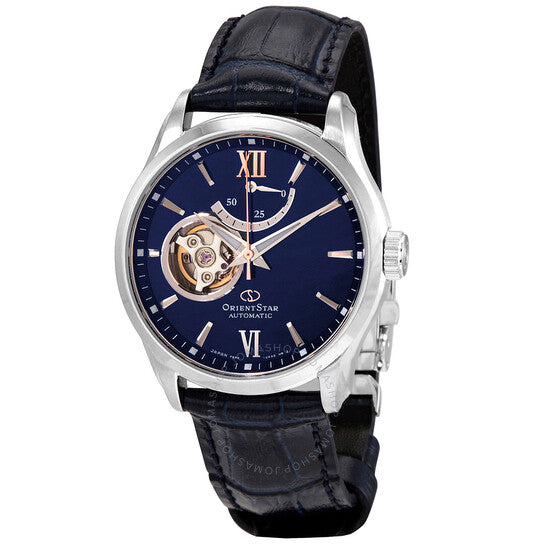 علبة من الفولاذ المقاوم للصدأ مع سوار جلدي أزرق. إطار ثابت من الفولاذ المقاوم للصدأ. ميناء أزرق (قلب مفتوح) مع عقارب فضية مضيئة على شكل دوفين وعلامات ساعات. تظهر أرقام رومانية عند موضعي الساعة 6 و12. علامات دقائق حول الحافة الخارجية. نوع الميناء: تناظري. عقارب وعلامات مضيئة. موانئ فرعية لمؤشر احتياطي الطاقة. حركة أورينت أوتوماتيكية من عيار F6R42 باحتياطي طاقة يصل إلى 50 ساعة. زجاج من الياقوت المقاوم للخدش. تاج قابل للسحب/الدفع. غطاء خلفي شفاف. شكل دائري. حجم العلبة: 39 مم. سمكها: 12 مم. مشبك قابل للطي بزر ضغط. مقاومة للماء حتى عمق 100 متر / 330 قدمًا. الوظائف: الساعة، الدقيقة، الثانية. سلسلة أورينت ستار. طراز ساعة رسمية. ملصق الساعة: Japan Movt. ساعة أورينت ستار أوتوماتيكية للرجال بمينا أزرق RE-AT0006L00B.
