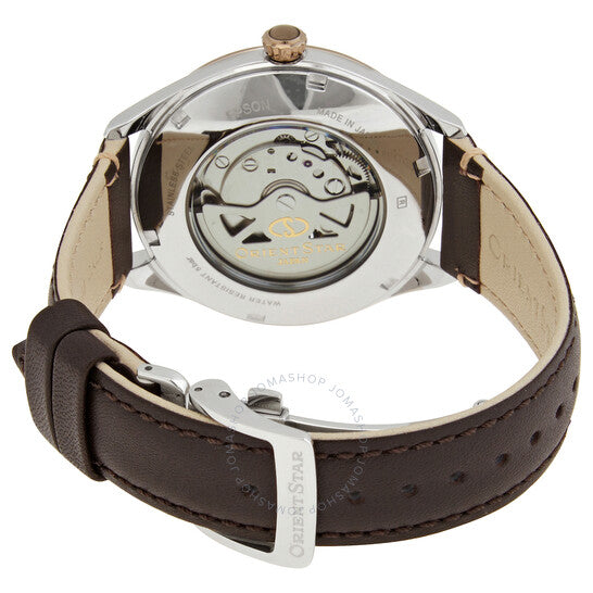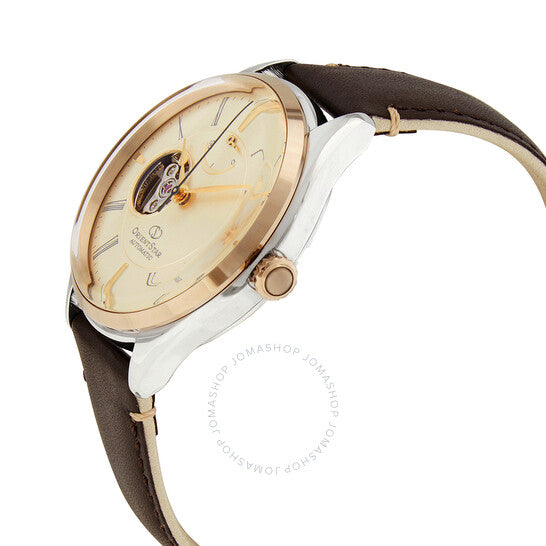 علبة من الفولاذ المقاوم للصدأ مع سوار جلدي بني. إطار ذهبي ثابت. ميناء بلون الشمبانيا (مفتوح) مع عقارب ومؤشرات ساعات بلون الذهب الوردي. مؤشرات دقائق حول الحافة الخارجية. نوع الميناء: تناظري. موانئ فرعية لمؤشر احتياطي الطاقة. حركة أوتوماتيكية. زجاج معدني مقاوم للخدش. تاج قابل للسحب/الدفع. غطاء خلفي شفاف. شكل دائري، مقاس العلبة: 40.4 مم، سمكها: 12.8 مم. عرض السوار: 20 مم. مشبك تانغ. مقاومة للماء حتى عمق 50 مترًا / 165 قدمًا. الوظائف: الساعات، الدقائق، الثواني. سلسلة أورينت ستار. ساعة أورينت ستار أوتوماتيكية للرجال بمينا بلون الشمبانيا، RE-AT0201G00B.