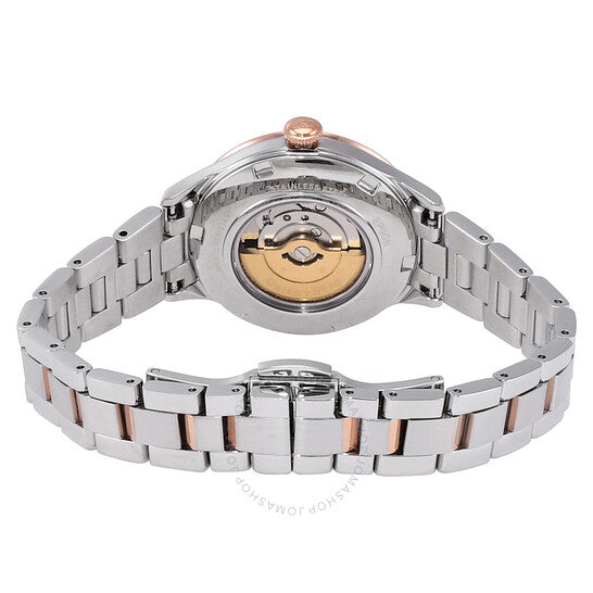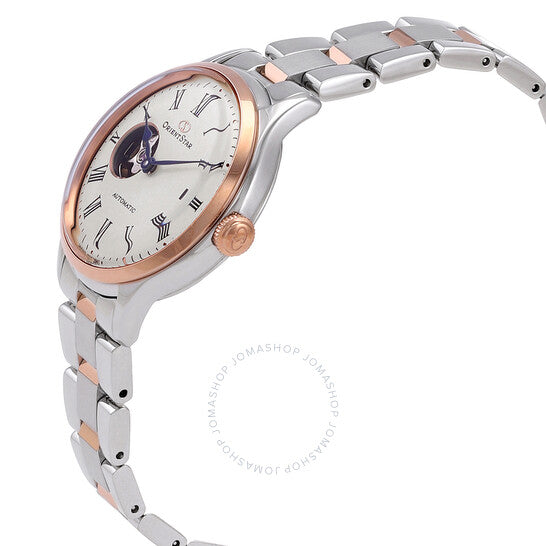 علبة من الفولاذ المقاوم للصدأ بسوار من الفولاذ المقاوم للصدأ ثنائي اللون (فضي وذهبي وردي). إطار ثابت من الذهب الوردي. ميناء أبيض (قلب مفتوح) بعقارب من الذهب الوردي وعلامات ساعات بأرقام رومانية. علامات دقائق حول الحافة الخارجية. يظهر مؤشر الأرقام الرومانية عند موضعي الساعة 6 و12. نوع الميناء: تناظري. حركة أوتوماتيكية من عيار 55C40 مع احتياطي طاقة لمدة 40 ساعة. زجاج معدني مقاوم للخدش. تاج لولبي. غطاء خلفي شفاف. شكل دائري. حجم العلبة: 30 مم. سمك العلبة: 10 مم. عرض السوار: 15 مم. مشبك قابل للطي بزر ضغط. مقاومة للماء حتى عمق 50 مترًا / 165 قدمًا. الوظائف: الساعة، الدقائق. سلسلة أورينت ستار. تصميم ساعة كاجوال. ملصق الساعة: Japan Movt. ساعة أورينت ستار أوتوماتيكية نسائية بمينا بيضاء RE-ND0001S00B.