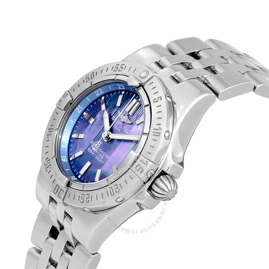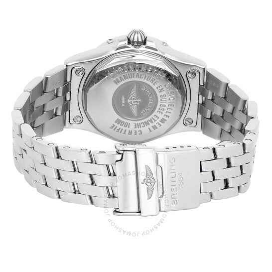 علبة وسوار من الفولاذ المقاوم للصدأ فضي اللون. ميناء أزرق من عرق اللؤلؤ مع عقارب ومؤشرات ساعات فضية اللون. مؤشرات دقائق حول الحافة الخارجية. نوع الميناء: تناظري. عقارب ومؤشرات مضيئة. عرض التاريخ عند موضع الساعة 3. حركة كوارتز. زجاج ياقوتي مقاوم للخدش. علبة دائرية الشكل، مقاسها 30 مم. الوظائف: التاريخ، الساعات، الدقائق، الثواني. سلسلة ستارلاينر. تصميم ساعة فاخرة. علامة الساعة: صناعة سويسرية. ساعة بريتلينغ ستارلاينر كوارتز نسائية A7134012/B796.360A.