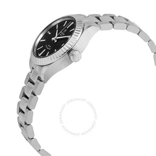 علبة من الفولاذ المقاوم للصدأ مع سوار من الفولاذ المقاوم للصدأ. إطار ثابت مُخدّد من الفولاذ المقاوم للصدأ. ميناء أسود بعقارب فضية اللون وعلامات ساعات مُؤشّرة. علامات دقائق حول الحافة الخارجية. نوع الميناء: تناظري. عرض التاريخ عند موضع الساعة الثالثة. حركة أوتوماتيكية من عيار تيودور 2671، مبنية على ETA 2671، تحتوي على 25 جوهرة، تنبض بمعدل 28800 ذبذبة في الساعة، ولديها احتياطي طاقة لمدة 38 ساعة تقريبًا. زجاج من الياقوت المقاوم للخدش. تاج لولبي. غطاء خلفي صلب. شكل دائري. حجم العلبة: 28 مم. مشبك قابل للطي مع مفتاح أمان. مقاومة للماء حتى عمق 100 متر / 330 قدمًا. الوظائف: التاريخ، الساعة، الدقيقة، الثانية. سلسلة الطراز. طراز ساعة فاخرة. علامة الساعة: صناعة سويسرية. ساعة أوتوماتيكية نسائية من طراز تيودور بمينا سوداء مقاس 28 مم، طراز M12110-0003.
