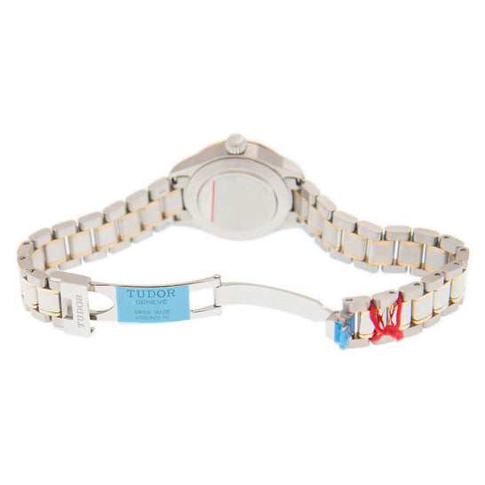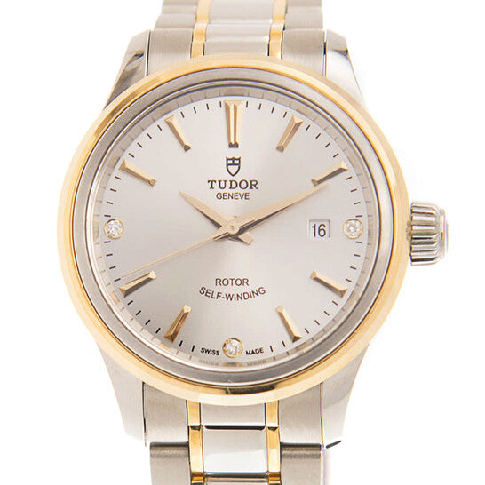 علبة من الفولاذ المقاوم للصدأ مع سوار من الفولاذ المقاوم للصدأ بوصلات من الذهب الأصفر. إطار مزدوج ثابت من الفولاذ المقاوم للصدأ والذهب الأصفر. ميناء بلون الشمبانيا مع عقارب ذهبية اللون وعلامات ساعات. مرصعة بالألماس عند الساعة 3 و6 و9. علامات دقائق حول الحافة الخارجية. نوع الميناء: تناظري. عرض التاريخ عند الساعة 3. حركة أوتوماتيكية من عيار تيودور 2671، مبنية على ETA 2671، تحتوي على 25 جوهرة، تنبض بمعدل 28800 ذبذبة في الساعة، ولديها احتياطي طاقة لمدة 38 ساعة تقريبًا. زجاج من الياقوت المقاوم للخدش. تاج لولبي. غطاء خلفي صلب. شكل دائري. حجم العلبة: 28 مم. مشبك قابل للطي. مقاومة للماء حتى عمق 100 متر / 330 قدمًا. الوظائف: التاريخ، الساعة، الدقيقة، الثانية. تصميم ساعة فاخر. علامة الساعة: صناعة سويسرية. ساعة نسائية أوتوماتيكية من طراز تيودور بمينا بلون الشمبانيا 12