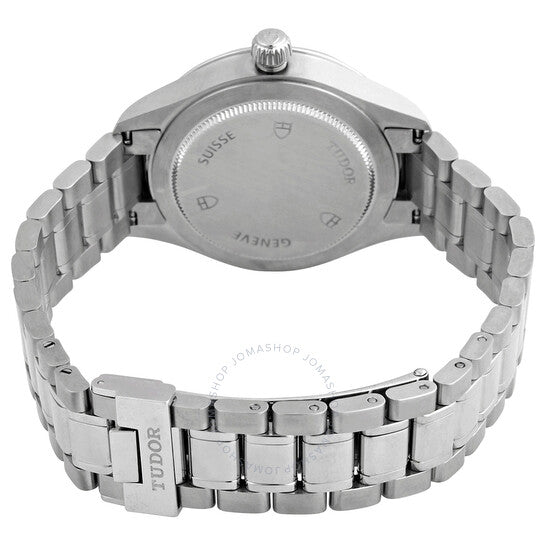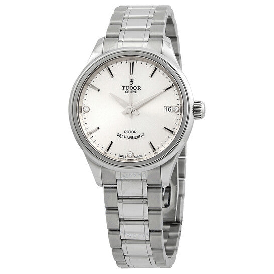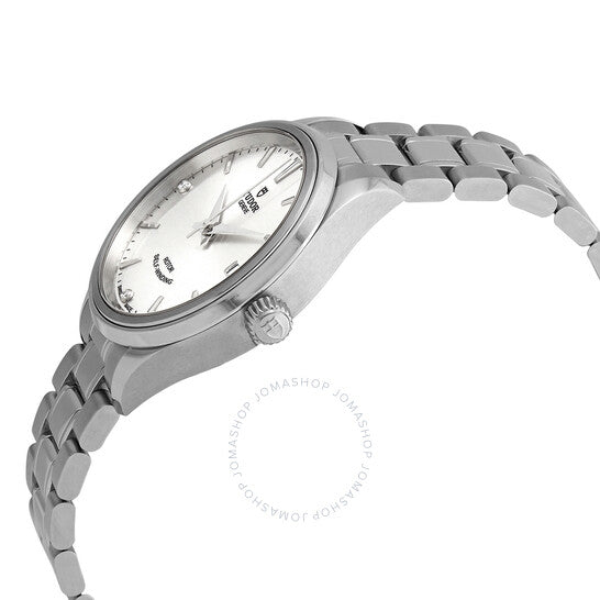 علبة من الفولاذ المقاوم للصدأ مع سوار من الفولاذ المقاوم للصدأ. إطار ثابت من الفولاذ المقاوم للصدأ. ميناء فضي مع عقارب مضيئة بلون فضي وعلامات ساعات. تظهر علامات ألماس عند الساعة 3 و6 و9. علامات دقائق حول الحافة الخارجية. نوع الميناء: تناظري. عقارب مضيئة. عرض التاريخ عند الساعة 3. حركة أوتوماتيكية من عيار تيودور T601، مبنية على ETA 2824، تحتوي على 25 جوهرة، تنبض بمعدل 28800 ذبذبة في الساعة، ولديها احتياطي طاقة يدوم حوالي 38 ساعة. زجاج من الياقوت المقاوم للخدش. تاج لولبي. غطاء خلفي صلب. شكل دائري. حجم العلبة: 34 مم. مشبك قابل للطي مع مفتاح أمان. مقاومة للماء حتى عمق 100 متر / 330 قدمًا. الوظائف: التاريخ، الساعة، الدقائق، الثواني. سلسلة الطراز. طراز ساعة فاخرة. علامة الساعة: صناعة سويسرية. ساعة تيودور ستايل أوتوماتيكية للسيدات بمينا فضي وماسي طراز M12300-0003.