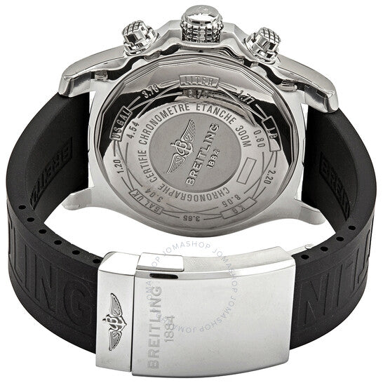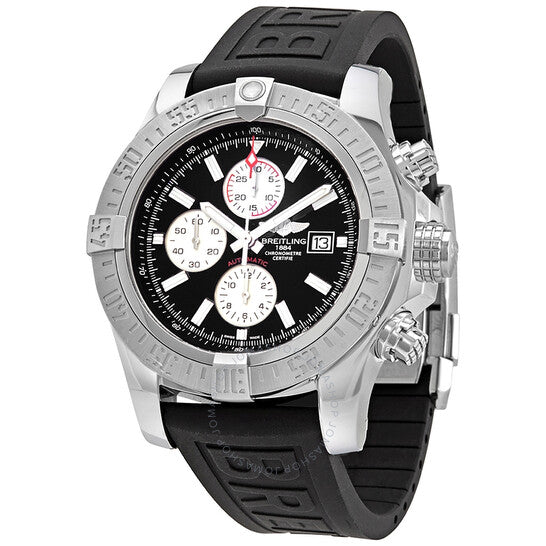 علبة من الفولاذ المقاوم للصدأ مع سوار مطاطي أسود. إطار دوار أحادي الاتجاه من الفولاذ المقاوم للصدأ. ميناء أسود بركاني مع عقارب وعلامات ساعات فضية مضيئة. علامات دقائق. علامات 1/100 ثانية حول الحافة الخارجية. نوع الميناء: تناظري. عقارب وعلامات مضيئة. عرض التاريخ عند موضع الساعة 3. كرونوغراف - ثلاثة موانئ فرعية فضية تعرض: 60 ثانية، 30 دقيقة، و12 ساعة. حركة بريتلينغ أوتوماتيكية كاليبر 13، مبنية على ETA Valjoux 7750، تحتوي على 25 جوهرة، تنبض بمعدل 28800 ذبذبة في الساعة، ولديها احتياطي طاقة لمدة 42 ساعة تقريبًا. زجاج ياقوت مقاوم للخدش. تاج مُغلق ببرغي. غطاء خلفي صلب. شكل دائري. حجم العلبة: 48 مم. سمك العلبة: 17.75 مم. عرض السوار: 24 مم. مشبك قابل للطي بزر ضغط. مقاومة للماء حتى عمق ٣٠٠ متر / ١٠٠٠ قدم. الوظائف: كرونوغراف، تاريخ، ساعات، دقائق، ثوانٍ. تصميم فاخر. علامة الساعة: صناعة سويسرية. ساعة بريتلينغ سوبر أفينجر II كرونوغراف أوتوماتيكية للرجال A13371111B1S1.