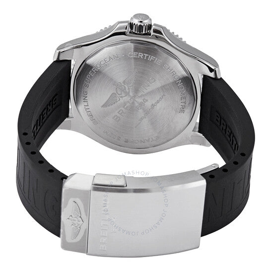 علبة من الفولاذ المقاوم للصدأ مع سوار مطاطي أسود. إطار دوار أحادي الاتجاه من الفولاذ المقاوم للصدأ بحافة معدنية مع حلقة علوية سوداء (للعد التصاعدي للوقت المنقضي). ميناء أسود بعقارب ومؤشرات ساعات فضية مضيئة. أرقام عربية تُشير إلى مواقع الساعات 6 و9 و12. مؤشرات دقائق حول الحافة الخارجية. نوع الميناء: تناظري. عقارب ومؤشرات مضيئة. عرض التاريخ عند موضع الساعة 3. حركة بريتلينغ أوتوماتيكية كاليبر 17، مبنية على ETA 2824-2، تحتوي على 25 جوهرة، تنبض بمعدل 28800 ذبذبة في الساعة، ولديها احتياطي طاقة لمدة 38 ساعة تقريبًا. زجاج ياقوت مقاوم للخدش. تاج مُغلق ببرغي. غطاء خلفي صلب. شكل دائري. حجم العلبة: 42 مم. سمك العلبة: 13.3 مم. عرض السوار: 20 مم. مشبك قابل للطي مع مفتاح أمان. مقاومة للماء حتى عمق 500 متر / 1650 قدمًا. الوظائف: التاريخ، الساعة، الدقيقة، الثانية. سلسلة سوبر أوشن ٤٢. طراز ساعة غوص. علامة الساعة: صناعة سويسرية. ساعة بريتلينغ سوبر أوشن ٤٢ أوتوماتيكية للرجال بمينا أسود، A17366021B1S2.