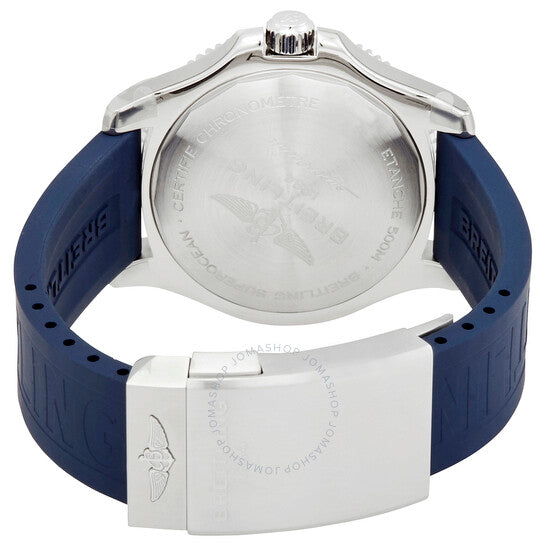 علبة من الفولاذ المقاوم للصدأ مع سوار مطاطي أزرق (دايفر برو 3). إطار دوار أحادي الاتجاه من الفولاذ المقاوم للصدأ بحافة معدنية وحلقة علوية زرقاء (للعد التصاعدي للوقت المنقضي). ميناء أزرق مع عقارب ومؤشرات ساعات فضية مضيئة. أرقام عربية تُشير إلى مواقع الساعات 6 و9 و12. مؤشرات دقائق حول الحافة الخارجية. نوع الميناء: تناظري. عقارب ومؤشرات مضيئة. عرض التاريخ عند موضع الساعة 3. حركة بريتلينج أوتوماتيكية كاليبر 17، مبنية على ETA 2824-2، تحتوي على 25 جوهرة، تنبض بمعدل 28800 ذبذبة في الساعة، ولديها احتياطي طاقة لمدة 42 ساعة تقريبًا. زجاج ياقوت مقاوم للخدش. تاج مُغلق ببرغي. غطاء خلفي صلب. شكل دائري. حجم العلبة: 42 مم. سمك العلبة: 13.30 مم. عرض السوار: 20 مم. مشبك قابل للطي. مقاومة للماء حتى عمق 500 متر / 1650 قدمًا. الوظائف: التاريخ، الساعات، الدقائق، الثواني، الكرونومتر. سلسلة سوبر أوشن. طراز ساعة غوص. علامة الساعة: صناعة سويسرية. ساعة بريتلينغ سوبر أوشن أوتوماتيكية كرونومتر بمينا زرقاء للرجال، A17366D81C1S2.