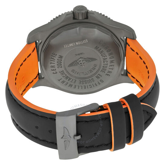 علبة من الفولاذ المقاوم للصدأ مطلية باللون الأسود (PVD) مع سوار جلدي أسود (خلفية برتقالية). إطار دوار أحادي الاتجاه مطلي باللون الأسود (PVD) مع حلقة علوية برتقالية. ميناء أسود بعقارب ومؤشرات ساعات برتقالية مضيئة. أرقام عربية تُشير إلى موضعي الساعة السادسة والتاسعة. مؤشرات دقائق حول الحافة الخارجية. نوع الميناء: تناظري. عقارب ومؤشرات مضيئة. عرض التاريخ عند موضع الساعة الثالثة. آلية حركة أوتوماتيكية. زجاج ياقوت مقاوم للخدش. تاج مُغلق ببرغي. غطاء خلفي صلب. حجم العلبة: ٤٤ مم. سُمكها: ١٤.٢٠ مم. شكلها دائري. عرض السوار: ٢٢ مم / ٢٠ مم. مشبك تانغ. مقاومة للماء حتى عمق ٢٠٠٠ متر / ٦٦٠٠ قدم. الوظائف: التاريخ، الساعة، الدقائق، الثواني. معلومات إضافية: إصدار محدود من ٢٥٠ قطعة. تصميم ساعة فاخرة. علامة الساعة: سويسرية الصنع. ساعة بريتلينج سوبر أوشن الأوتوماتيكية للرجال M1739101-BD81 230X-M20BASA.1.