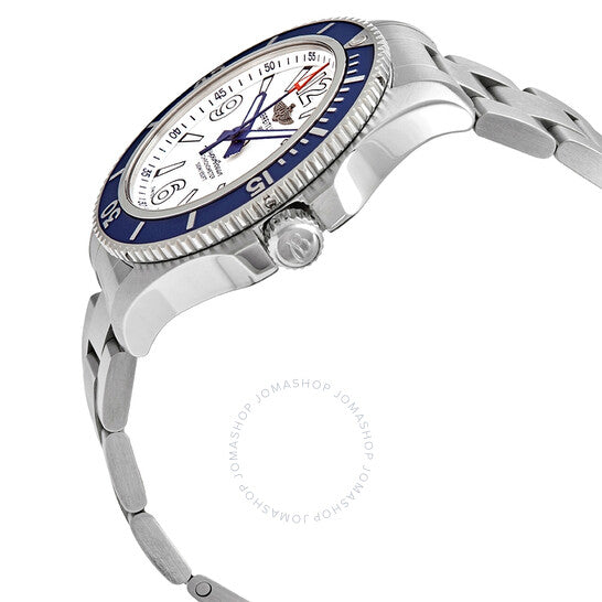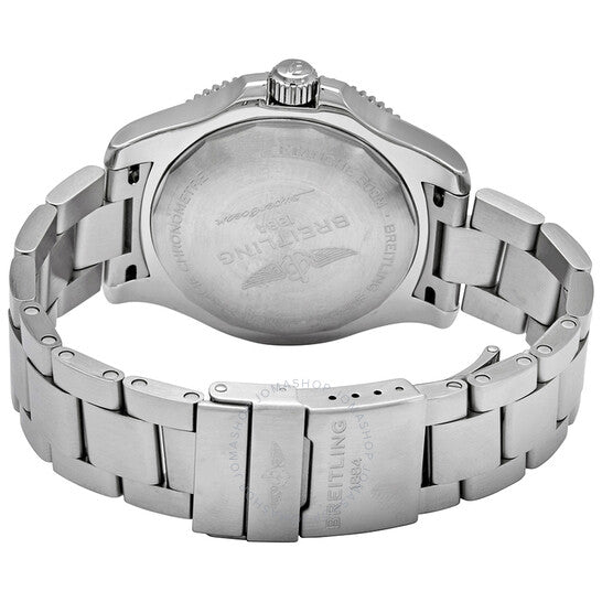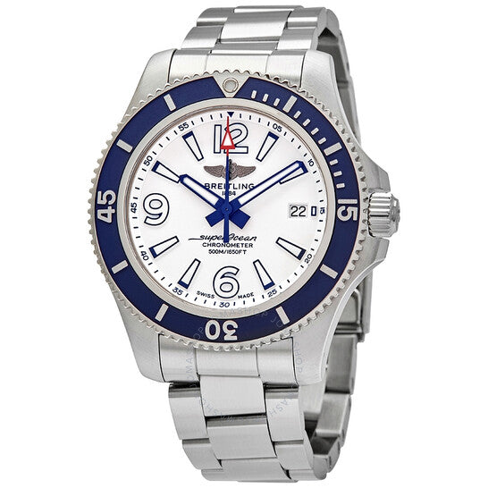 علبة من الفولاذ المقاوم للصدأ مع سوار من الفولاذ المقاوم للصدأ. إطار دوار أحادي الاتجاه من الفولاذ المقاوم للصدأ بحافة عملة معدنية مع حلقة علوية زرقاء (للعد التصاعدي للوقت المنقضي). ميناء أبيض بعقارب زرقاء مضيئة وعلامات مؤشر للساعات. أرقام عربية تشير إلى مواقع الساعات 6 و9 و12. علامات دقائق حول الحافة الخارجية. نوع الميناء: تناظري. عقارب وعلامات مضيئة. عرض التاريخ عند موضع الساعة 3. حركة بريتلينغ أوتوماتيكية كاليبر 17، مبنية على ETA 2824-2، تحتوي على 25 جوهرة، تنبض بمعدل 28800 ذبذبة في الساعة، ولديها احتياطي طاقة لمدة 42 ساعة تقريبًا. كريستال ياقوت مقاوم للخدش. تاج مغلق ببرغي. ظهر علبة صلب. شكل العلبة دائري. حجم العلبة: 42 مم. سمك العلبة: 13.30 مم. عرض السوار: 20 مم / 18 مم. مشبك قابل للطي. مقاومة للماء حتى عمق 500 متر / 1650 قدمًا. الوظائف: التاريخ، الساعة، الدقيقة، الثانية. سلسلة سوبر أوشن. تصميم ساعة فاخر. علامة الساعة: صناعة سويسرية. ساعة بريتلينغ سوبر أوشن أوتوماتيكية للرجال بمينا أبيض A17366D81A1A1.