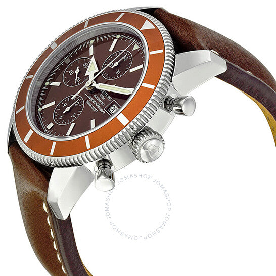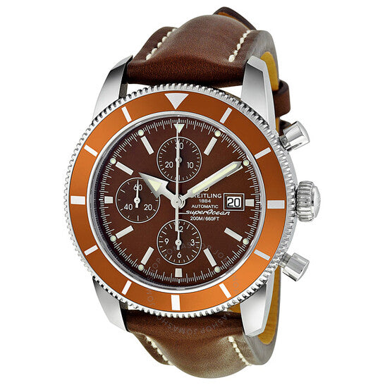 علبة من الفولاذ المقاوم للصدأ مع حزام جلدي بني. إطار دوار أحادي الاتجاه من الفولاذ المقاوم للصدأ مع حلقة علوية مطلية بالأيونات بنية اللون. ميناء بني مع عقارب وعلامات ساعات فضية مضيئة. علامات دقائق حول الحافة الخارجية. نوع الميناء: تناظري. عقارب وعلامات مضيئة. عرض التاريخ عند موضع الساعة 3. كرونوغراف - ثلاثة أقراص فرعية تعرض: 60 ثانية، 30 دقيقة، و12 ساعة. حركة بريتلينغ أوتوماتيكية كاليبر 13 مع احتياطي طاقة لمدة 42 ساعة. كريستال ياقوت مقاوم للخدش. تاج مقفل ببرغي - حشوتان. غطاء خلفي صلب. شكل دائري، حجم العلبة: 46 مم. سمك العلبة: 16.8 مم. عرض السوار: 24 مم / 20 مم، طول السوار: 9 بوصات. مشبك تانغ. مقاومة للماء حتى عمق 200 متر / 660 قدمًا. الوظائف: كرونوغراف، كرونومتر، تاريخ، ساعة، دقيقة، ثانية. تصميم ساعة فاخرة. ساعة بريتلينج سوبر أوشن كرونوغراف بمينا بني للرجال A1332033-Q553BRLT.