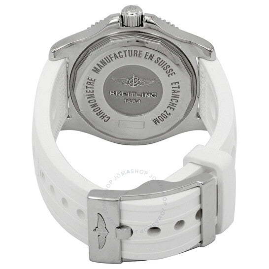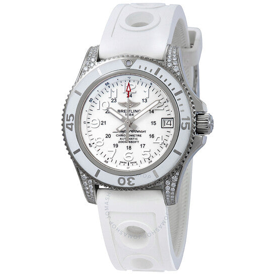 علبة من الفولاذ المقاوم للصدأ مع سوار مطاطي أبيض (أوشن ريسر II). عروات مرصعة بالألماس. إطار دوار أحادي الاتجاه من الفولاذ المقاوم للصدأ مع تطعيم مطاطي أبيض. ميناء أبيض بعقارب فضية مضيئة وعلامات ساعات عربية. علامات ٢٤ ساعة. علامات دقائق حول الحافة الخارجية. نوع الميناء: تناظري. عقارب وعلامات مضيئة. عرض التاريخ عند موضع الساعة ٣. حركة أوتوماتيكية من بريتلينغ كاليبر ١٧ مع احتياطي طاقة ٤٠ ساعة. زجاج من الياقوت المقاوم للخدش. تاج مُغلق ببرغي. غطاء خلفي صلب. شكل دائري. حجم العلبة: ٣٦ مم. سمكها: ١١.٢٥ مم. عرض السوار: ١٨ مم / ١٦ مم. مشبك تانغ. مقاومة للماء حتى عمق ٢٠٠ متر / ٦٦٠ قدمًا. الوظائف: التاريخ، الساعة، الدقائق، الثواني، الكرونومتر. تصميم ساعة فاخرة. علامة الساعة: سويسرية الصنع. ساعة بريتلينج سوبر أوشن 2 الأوتوماتيكية كرونومتر للسيدات A1731267/A775-230S.