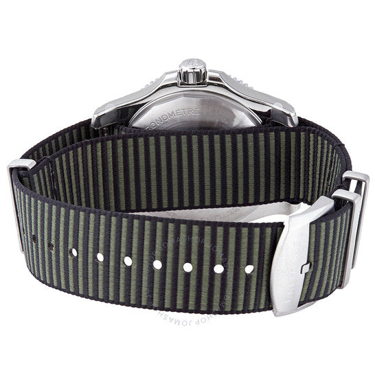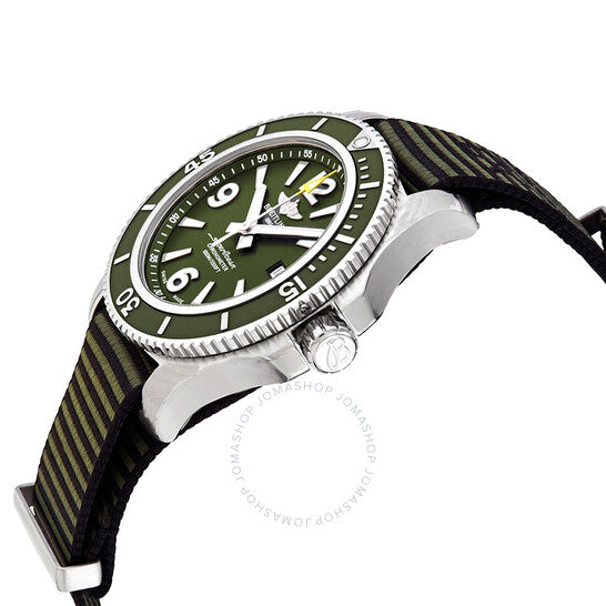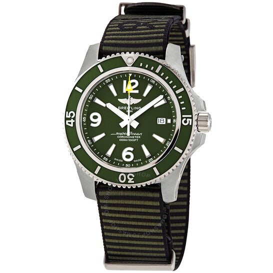 علبة من الفولاذ المقاوم للصدأ مع سوار نايلون ناتو أخضر. إطار دوار أحادي الاتجاه من الفولاذ المقاوم للصدأ مع حلقة مطلية باللون الأخضر. ميناء أخضر مع عقارب رمادية مضيئة ومؤشرات للساعات. أرقام عربية تُشير إلى مواقع الساعات 6 و9 و12. مؤشرات للدقائق حول الحافة الخارجية. نوع الميناء: تناظري. عقارب ومؤشرات مضيئة. عرض التاريخ عند موضع الساعة 3. حركة بريتلينغ أوتوماتيكية كاليبر 17، مبنية على ETA 2824-2، تحتوي على 25 جوهرة، تنبض بمعدل 28800 ذبذبة في الساعة، ولديها احتياطي طاقة لمدة 42 ساعة تقريبًا. زجاج ياقوت مقاوم للخدش. تاج مُغلق ببرغي. غطاء خلفي صلب. شكل دائري. حجم العلبة: 44 مم. سمك العلبة: 14.2 مم. عرض السوار: 20 مم. مشبك تانغ. مقاومة للماء حتى عمق 500 متر / 1650 قدمًا. الوظائف: التاريخ، الساعة، الدقائق، الثواني. سلسلة سوبر أوشن II. ساعة غوص أنيقة. علامة الساعة: صناعة سويسرية. ساعة بريتلينغ سوبر أوشن II أوتوماتيكية للرجال بمينا أخضر A17367A11L1W1.