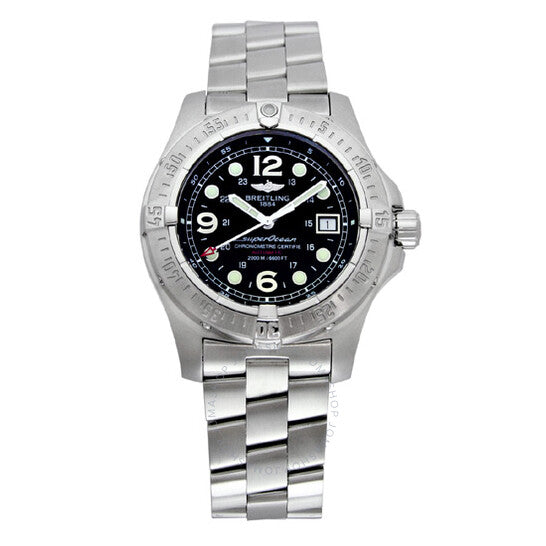 علبة من الفولاذ المقاوم للصدأ مع سوار من الفولاذ المقاوم للصدأ. إطار فولاذي دوار أحادي الاتجاه مزود بسقاطة. ميناء أسود بعقارب مضيئة وعلامات ساعات عربية ونقطية. مقياس توقيت غرينتش حول الحلقة الداخلية. عقارب مضيئة وعلامات ميناء. نافذة عرض التاريخ عند موضع الساعة 3. حركة أوتوماتيكية. زجاج ياقوتي مقاوم للخدش. تاج مُغلق ببرغي مع حشيتين. غطاء خلفي مُثبت ببرغي. قطر العلبة: 44 مم. سُمكها: 16.10 مم. مشبك قابل للطي. مقاومة للماء حتى عمق 2000 متر / 6600 قدم. الوظائف: الساعات، الدقائق، الثواني، التاريخ، توقيت غرينتش. ساعة بريتلينغ سوبر أوشن ستيل فيش الرجالية A1739010-B772SS.