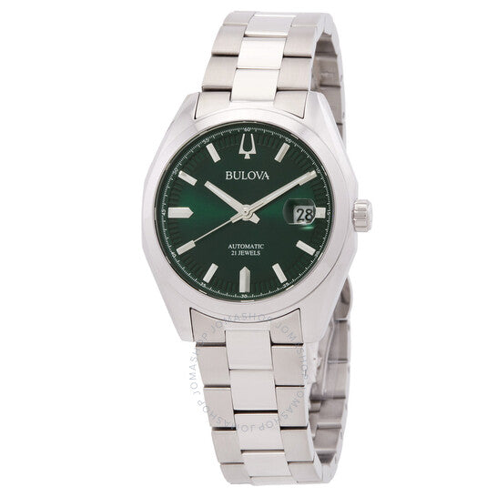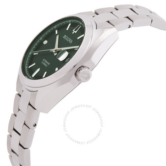 علبة وسوار من الفولاذ المقاوم للصدأ فضي اللون. إطار ثابت من الفولاذ المقاوم للصدأ فضي اللون. ميناء أخضر مع عقارب وعلامات ساعات فضية اللون. مقياس دقائق حول الحافة الداخلية. نوع الميناء: تناظري. عقارب وعلامات مضيئة. عرض التاريخ عند موضع الساعة 3. حركة أوتوماتيكية من بولوفا كاليبر 8215 مع احتياطي طاقة لمدة 42 ساعة. زجاج ياقوت مقاوم للخدش. غطاء خلفي شفاف. هيكل دائري الشكل، مقاسه 39 مم. عرض السوار: 20 مم. مشبك قابل للطي بزر ضغط. مقاومة للماء حتى عمق 30 مترًا / 100 قدم. الوظائف: التاريخ، الساعة، الدقائق، الثواني. سلسلة سيرفيور. طراز الساعة الرياضية. ساعة بولوفا سيرفيور أوتوماتيكية للرجال بمينا أخضر 96B429.