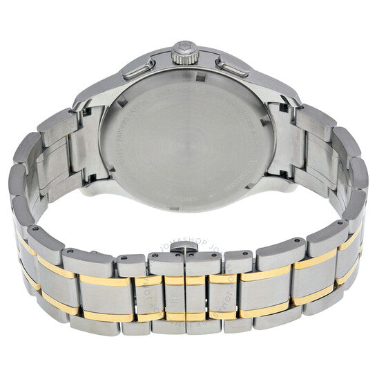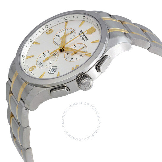 علبة من الفولاذ المقاوم للصدأ مع سوار من الفولاذ المقاوم للصدأ ثنائي اللون (فضي وذهبي). إطار ثابت من الفولاذ المقاوم للصدأ. ميناء فضي مع عقارب ومؤشرات ساعات ذهبية اللون. أرقام عربية تُشير إلى مواقع الساعات 3 و6 و9. علامات دقائق حول الحافة الخارجية. عقارب ومؤشرات مضيئة. يظهر عرض التاريخ بين موقعي الساعة 4 و5. كرونوغراف - ثلاثة أقراص فرعية تعرض: 60 ثانية، 30 دقيقة، و1/10 من الثانية. حركة كوارتز. كريستال ياقوت مقاوم للخدش. تاج فولاذي مزخرف. غطاء خلفي صلب. قطر العلبة: 42 مم. مشبك قابل للطي بزر ضغط. مقاومة للماء حتى عمق 100 متر / 330 قدمًا. ساعة فيكتورينوكس سويس آرمي ألاينس كرونوغراف للرجال 241481.