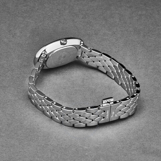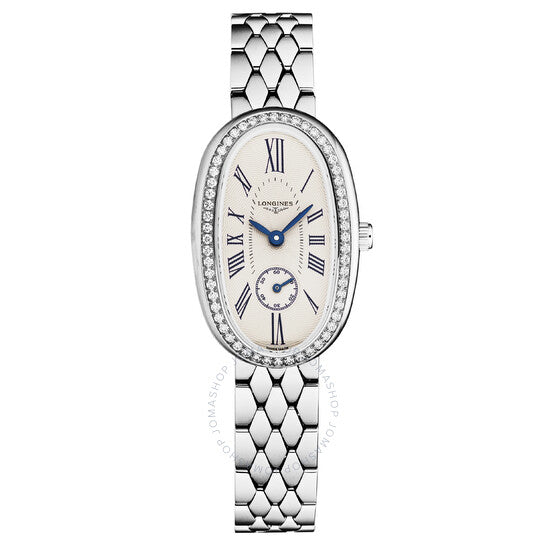 علبة من الفولاذ المقاوم للصدأ فضية اللون مع سوار فضي اللون. إطار ثابت مرصع بالألماس. ميناء فضي اللون مع عقارب زرقاء وعلامات ساعات من الألماس. نوع الميناء: تناظري. ميناء فرعي للثواني الصغيرة. حركة كوارتز لونجين كاليبر L176. كريستال ياقوتي مقاوم للخدش. غطاء خلفي صلب. مقاس العلبة: 21.90 مم × 34.00 مم. شكل العلبة بيضاوي. عرض السوار: 11 مم. مشبك قابل للطي. مقاومة للماء حتى عمق 30 مترًا / 100 قدم. الوظائف: الساعات، الدقائق، الثواني الصغيرة. طراز ساعة رسمية. علامة الساعة: صناعة سويسرية. إصدارات المنتج: L2.306.0.71.6. ساعة لونجين سيمفونيت الماسية النسائية L2.306.0.71.6.