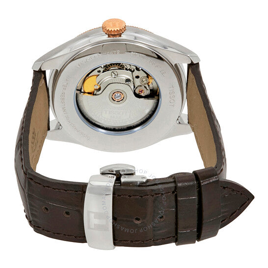 علبة من الفولاذ المقاوم للصدأ مع سوار جلدي بني. إطار ثابت من الذهب الوردي عيار 18 قيراطًا مطلي بتقنية الترسيب الفيزيائي للبخار (PVD). ميناء فضي اللون مع عقارب ومؤشرات ساعات ذهبية اللون. أرقام عربية تُشير إلى موضعي الساعة 6 و12. مؤشرات دقائق حول الحافة الخارجية. نوع الميناء: تناظري. عرض التاريخ عند موضع الساعة 3. حركة أوتوماتيكية باورماتيك 80 مع احتياطي طاقة يصل إلى 80 ساعة. زجاج ياقوت مقاوم للخدش. غطاء خلفي شفاف. حجم العلبة: 39 مم. سُمكها: 9.84 مم. شكلها دائري. عرض السوار: 20 مم. مشبك فراشة. مقاومة للماء حتى عمق 50 مترًا / 165 قدمًا. الوظائف: التاريخ، الساعة، الدقيقة، الثانية. طراز ساعة رسمية. علامة الساعة: صناعة سويسرية. ساعة تيسوت تي-كلاسيك باليد أوتوماتيكية للرجال بمينا فضي، T108.408.26.037.00.