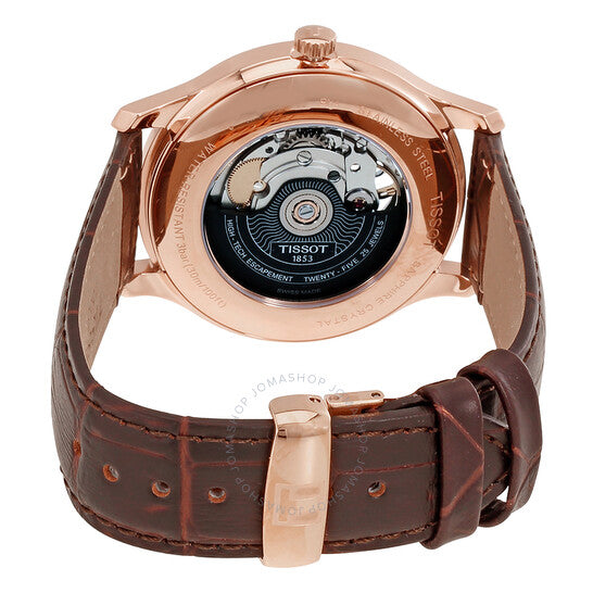 علبة من الفولاذ المقاوم للصدأ مطلية بالذهب الوردي بتقنية PVD مع سوار من الجلد البني. إطار ثابت مطلي بالذهب الوردي بتقنية PVD. ميناء فضي (قلب مفتوح) مع عقارب على شكل دوفين بلون الذهب الوردي وعلامات ساعات مؤشرة. يظهر الرقم الروماني عند موضع الساعة 12. علامات الدقائق حول الحافة الخارجية. نوع الميناء: تناظري. حركة أوتوماتيكية Tissot Calibre Powermatic 80.601، مبنية على Tissot Calibre Powermatic 80، تحتوي على 23 جوهرة، تنبض بمعدل 21600 ذبذبة في الساعة، ولديها احتياطي طاقة لمدة 80 ساعة تقريبًا. كريستال ياقوت مقاوم للخدش. تاج سحب/دفع. غطاء خلفي شفاف. شكل دائري. حجم العلبة: 40 مم. سمك العلبة: 9.4 مم. عرض السوار: 20 مم. مشبك فراشة. مقاومة للماء حتى عمق 30 مترًا / 100 قدم. الوظائف: الساعة، الدقيقة، الثانية. طراز ساعة رسمية. ملصق الساعة: صنع سويسري. ساعة تيسوت تي كلاسيك تراديشن أوتوماتيكية بمينا فضي للرجال T063.907.36.038.00.