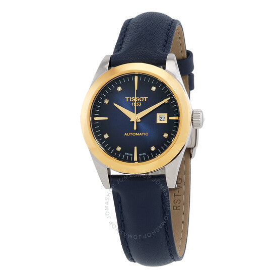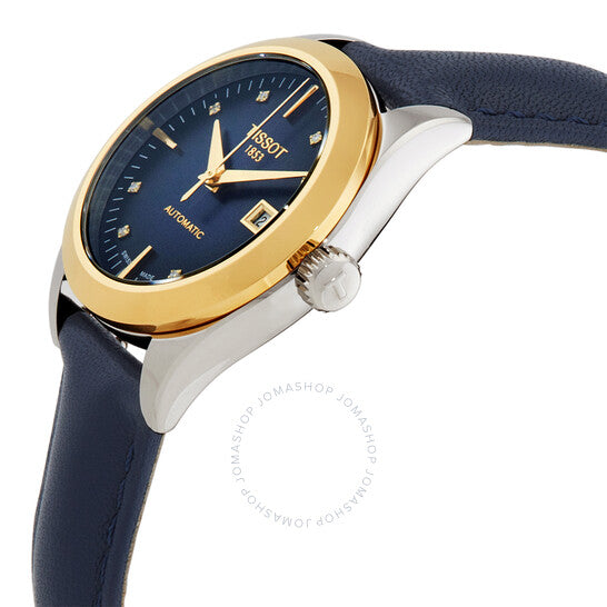 علبة من الفولاذ المقاوم للصدأ فضية اللون مع سوار جلدي أزرق. إطار ثابت من الذهب الأصفر عيار 18 قيراطًا. ميناء أزرق مع عقارب ومؤشرات ذهبية اللون وعلامات ساعات مرصعة بالألماس. علامات دقائق حول الحافة الخارجية. نافذة لعرض التاريخ عند موضع الساعة 3. حركة أوتوماتيكية POWERMATIC 48.111 مع احتياطي طاقة 48. زجاج ياقوت مقاوم للخدش. غطاء خلفي شفاف. شكل العلبة دائري، مقاسها: 29 مم، سمكها: 10.4 مم. عرض السوار: 15.00 مم. إبزيم فراشة بزر ضغط. مقاومة للماء حتى عمق 50 مترًا / 165 قدمًا. الوظائف: التاريخ، الساعة، الدقائق، الثواني. سلسلة T-gold. طراز ساعة رسمية. علامة الساعة: صناعة سويسرية. ساعة تيسوت T-Gold أوتوماتيكية نسائية بمينا زرقاء مرصعة بالألماس T930.007.46.046.00.