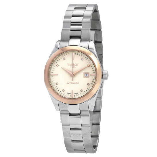 علبة فضية اللون من الفولاذ المقاوم للصدأ مع سوار رمادي من الفولاذ المقاوم للصدأ. إطار ثابت من الذهب الوردي عيار 18 قيراطًا. ميناء كريمي من الأوبالين مع عقارب ومؤشرات باللون الوردي وعلامات ساعات مرصعة بالألماس. علامات دقائق حول الحافة الخارجية. نافذة لعرض التاريخ عند موضع الساعة 3. حركة أوتوماتيكية POWERMATIC 48.111 مع احتياطي طاقة 48. زجاج ياقوتي مقاوم للخدش. غطاء خلفي شفاف. علبة دائرية الشكل، مقاس العلبة: 29 مم، سمكها: 10.4 مم. عرض السوار: 15.00 مم. مشبك فراشة. مقاومة للماء حتى عمق 50 مترًا / 165 قدمًا. الوظائف: التاريخ، الساعة، الدقيقة، الثانية. سلسلة T-gold. طراز ساعة رسمية. علامة الساعة: صناعة سويسرية. ساعة تيسوت T-Gold أوتوماتيكية نسائية مرصعة بالألماس T930.007.41.266.00.