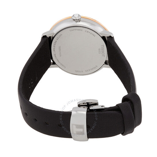 علبة من الفولاذ المقاوم للصدأ عيار 316L فضية اللون مع سوار جلدي أسود. إطار ثابت من الذهب الوردي عيار 18 قيراطًا. ميناء أسود بعقارب ومؤشرات ساعات ذهبية وردية اللون. مؤشرات دقائق حول الحافة الخارجية. نوع الميناء: تناظري. عرض التاريخ عند موضع الساعة السادسة. حركة كوارتز ETA F05.115. زجاج من الياقوت المقاوم للخدش. غطاء خلفي صلب. شكل دائري، مقاس العلبة: 33 مم، سمكها: 7.6 مم. عرض السوار: 16 مم. إبزيم فراشة بزر ضغط. مقاومة للماء حتى عمق 30 مترًا / 100 قدم. الوظائف: التاريخ، الساعة، الدقائق، الثواني، مؤشر انتهاء عمر البطارية. سلسلة T-gold. طراز ساعة رسمية. علامة الساعة: صناعة سويسرية. ساعة تيسوت T-Gold كوارتز نسائية بمينا سوداء، T929.210.46.051.00.