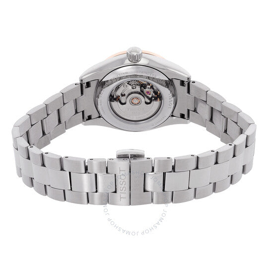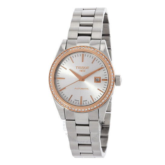 علبة وسوار من الفولاذ المقاوم للصدأ بلون فضي. إطار ثابت من الذهب الوردي عيار 18 قيراطًا مرصع بالألماس. ميناء فضي بعقارب ومؤشرات ساعات بلون ذهبي وردي. مؤشرات دقائق حول الحافة الخارجية. نوع الميناء: تناظري. عرض التاريخ عند موضع الساعة 3. حركة أوتوماتيكية. زجاج ياقوت مقاوم للخدش. تاج قابل للسحب/الدفع. غطاء خلفي شفاف. شكل دائري، مقاس العلبة: 29 مم، سمكها: 10.4 مم. عرض السوار: 15 مم. مشبك فراشة. مقاومة للماء حتى عمق 50 مترًا / 165 قدمًا. الوظائف: التاريخ، الساعة، الدقائق، الثواني. سلسلة تي-ماي ليدي. طراز ساعة رسمية. علامة الساعة: صناعة سويسرية. ساعة تي-ماي ليدي أوتوماتيكية من تيسو، بمينا فضي مرصع بالألماس، T930.007.41.031.00.