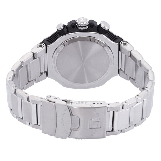 علبة من الفولاذ المقاوم للصدأ عيار 316L فضية اللون مع سوار فضي اللون. إطار ثابت من الفولاذ المقاوم للصدأ عيار 316L فضي اللون. ميناء أسود بعقارب وعلامات ساعات فضية اللون. مقياس سرعة الدوران حول الحافة الخارجية. نوع الميناء: تناظري. عقارب وعلامات مضيئة. عرض التاريخ بين الساعة 4 و5. كرونوغراف - ثلاثة أقراص فرعية تعرض: 60 ثانية، 60 دقيقة، و1/10 من الثانية. حركة كوارتز. زجاج ياقوتي مقاوم للخدش. غطاء خلفي صلب. شكل فريد للعلبة، مقاسها: 45 مم، سمكها: 11.8 مم. عرض السوار: 13.95 مم. مشبك قابل للطي مع مفتاح أمان. مقاومة للماء حتى عمق 100 متر / 330 قدمًا. الوظائف: كرونوغراف، تاريخ، ساعة، دقيقة، ثانية. سلسلة T-Race. طراز ساعة رياضية. علامة الساعة: صناعة سويسرية. ساعة تيسوت تي رايس كرونوغراف كوارتز بمينا سوداء للرجال T141.417.11.051.01.