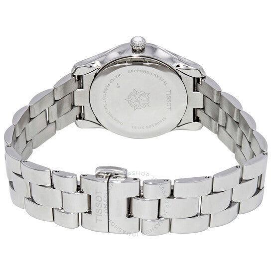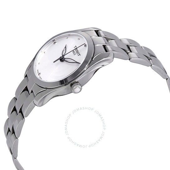 علبة من الفولاذ المقاوم للصدأ مع سوار من الفولاذ المقاوم للصدأ. إطار ثابت من الفولاذ المقاوم للصدأ. ميناء فضي بعقارب سوداء هيكلية وعلامات ساعات من الألماس. نوع الميناء: تناظري. حركة كوارتز ETA F04.111. زجاج ياقوت مقاوم للخدش. تاج قابل للسحب/الدفع. غطاء خلفي صلب. شكل دائري. حجم العلبة: 30 مم. سمكها: 8.7 مم. عرض السوار: 15 مم. مشبك فراشة. مقاومة للماء حتى عمق 30 مترًا / 100 قدم. وظائفها: الساعات، الدقائق، الثواني. تصميم كاجوال. علامة الساعة: صناعة سويسرية. ساعة تيسو تي-ويف نسائية مرصعة بالألماس بمينا فضي T112.210.11.036.00.