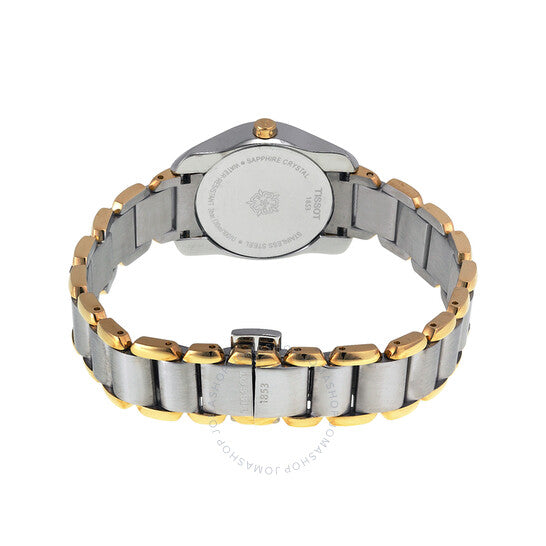 علبة من الفولاذ المقاوم للصدأ مع سوار من الفولاذ المقاوم للصدأ ثنائي اللون (فضي وذهبي بتقنية PVD). إطار ثابت من الفولاذ المقاوم للصدأ. ميناء من عرق اللؤلؤ مع عقارب هيكلية ذهبية اللون وعلامات ساعات. أرقام عربية تُشير إلى مواقع الساعات 3 و6 و9 و12. نوع الميناء: تناظري. حركة كوارتز. زجاج ياقوت مقاوم للخدش. غطاء خلفي صلب. أبعاد العلبة: 26 مم × 28.5 مم. سُمك العلبة: 7.95 مم. شكل العلبة دائري. عرض السوار: 11 مم. مشبك فراشة. مقاومة للماء حتى عمق 30 مترًا / 100 قدم. الوظائف: الساعات، الدقائق، الثواني. تصميم كاجوال. علامة الساعة: صناعة سويسرية. ساعة تيسو تي-ويف نسائية ثنائية اللون، بمينا من عرق اللؤلؤ، T023.210.22.117.00.
