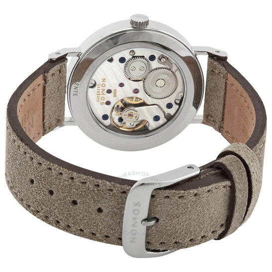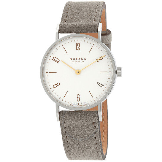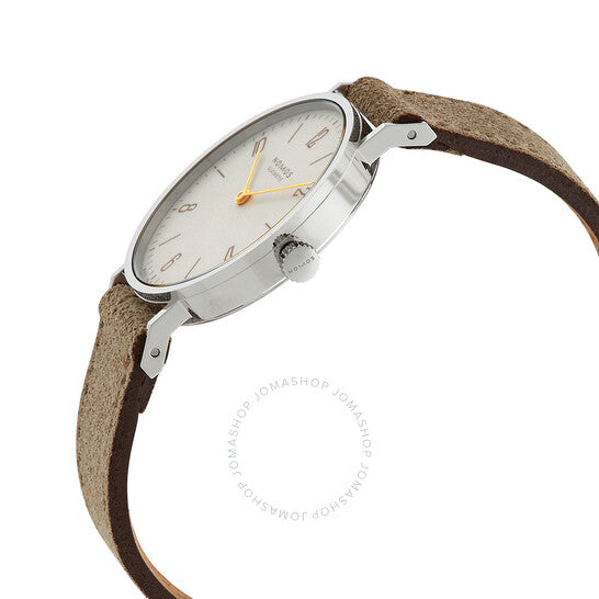 علبة فضية اللون من الفولاذ المقاوم للصدأ مع سوار جلدي بيج. إطار ثابت من الفولاذ المقاوم للصدأ. ميناء أبيض بعقارب ذهبية اللون وأرقام عربية للساعات. نوع الميناء: تناظري. حركة نوموس كاليبر ألفا.2 يدوية التعبئة، تحتوي على 17 جوهرة، تنبض بتردد 21600 ذبذبة في الساعة، ولديها احتياطي طاقة يدوم حوالي 43 ساعة. زجاج من الياقوت المقاوم للخدش. تاج قابل للسحب/الدفع. غطاء خلفي شفاف. شكل دائري، مقاس العلبة: 32.8 مم، سمكها: 6.5 مم. عرض السوار: 17 مم. مشبك تانغ. مقاومة للماء حتى عمق 30 مترًا / 100 قدم. الوظائف: الساعات، الدقائق. سلسلة تانغنتي. ملصق الساعة: صنع في ألمانيا. ساعة نوموس تانغنتي النسائية بمينا أبيض 127.