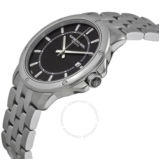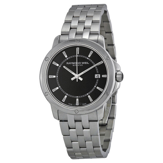 علبة من الفولاذ المقاوم للصدأ مع سوار من الفولاذ المقاوم للصدأ. إطار ثابت من الفولاذ المقاوم للصدأ. ميناء أسود بعقارب فضية مضيئة وعلامات ساعات. علامات دقائق حول حلقة داخلية. نوع الميناء: تناظري. عقارب وعلامات مضيئة. عرض التاريخ عند موضع الساعة 3. آلية حركة كوارتز. زجاج ياقوتي مقاوم للخدش. تاج قابل للسحب/الدفع. غطاء خلفي صلب. قطر العلبة: 39 مم. سمكها: 7.9 مم. شكلها دائري. عرض السوار: 22.9 مم. طول السوار: 9 بوصات. مشبك قابل للطي. مقاومة للماء حتى عمق 100 متر / 330 قدمًا. الوظائف: التاريخ، الساعة، الدقائق، الثواني. تصميم ساعة فاخرة. علامة الساعة: صناعة سويسرية. ساعة ريموند ويل تانجو للرجال بمينا أسود من الفولاذ المقاوم للصدأ 5591-ST-20001.