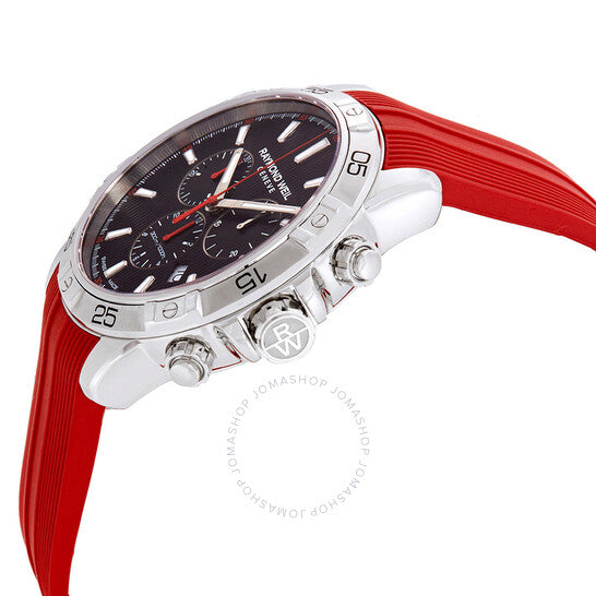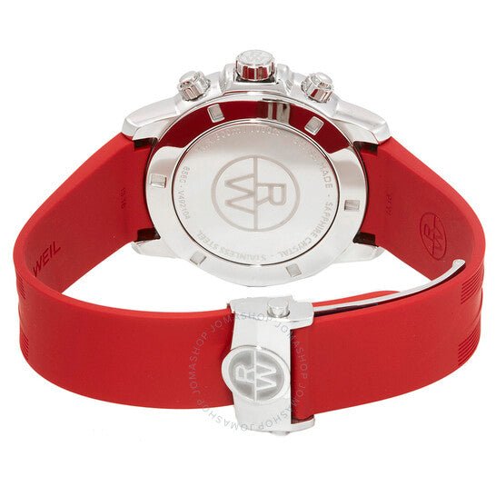 علبة فضية اللون من الفولاذ المقاوم للصدأ مع سوار مطاطي أحمر. إطار ثابت فضي اللون من الفولاذ المقاوم للصدأ. ميناء أسود بعقارب فضية اللون مضيئة وعلامات ساعات. علامات دقائق حول الحافة الخارجية. نوع الميناء: تناظري. عقارب وعلامات مضيئة. عرض التاريخ بين الساعة 4 و5. كرونوغراف - ثلاثة أقراص فرعية تعرض: 60 ثانية، 30 دقيقة، و12 ساعة. حركة كوارتز. زجاج ياقوت مقاوم للخدش. تاج لولبي. غطاء خلفي صلب. شكل دائري، مقاس العلبة: 43 مم، سمكها: 11.9 مم. عرض السوار: 20 مم. قابلة للطي مع مشبك مزدوج للفك. مقاومة للماء حتى عمق 300 متر / 1000 قدم. الوظائف: كرونوغراف، تاريخ، ساعة، دقيقة، ثانية. طراز ساعة غوص. علامة الساعة: صناعة سويسرية. ساعة ريموند ويل تانجو كرونوغراف للرجال بمينا سوداء، 8560-SR2-20001.