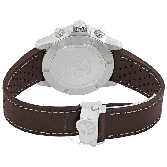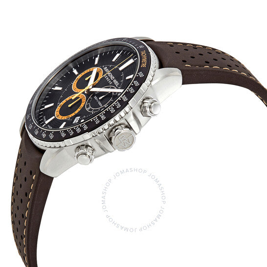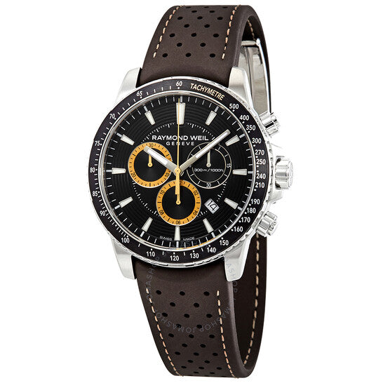 علبة من الفولاذ المقاوم للصدأ مع سوار مطاطي بني داكن. إطار ثابت من الفولاذ المقاوم للصدأ مع حلقة علوية من الألومنيوم الأسود تُظهر علامات التاكيميتر. ميناء أسود بعقارب ومؤشرات ساعات فضية مضيئة. علامات دقائق حول الحافة الخارجية. نوع الميناء: تناظري. عقارب ومؤشرات مضيئة. عرض التاريخ بين موضعي الساعة الرابعة والخامسة. آلية حركة كوارتز. زجاج ياقوتي مقاوم للخدش. تاج لولبي. غطاء خلفي صلب. شكل دائري. حجم العلبة: 43 مم. سمكها: 11.9 مم. عرض السوار: 22 مم. مشبك بزر ضغط. مقاومة للماء حتى عمق 300 متر / 1000 قدم. الوظائف: كرونوغراف، تاكيميتر، تاريخ، ساعة، دقيقة، ثانية. طراز ساعة غوص. علامة الساعة: صناعة سويسرية. ساعة ريموند ويل تانجو كرونوغراف للرجال بمينا سوداء 8570-SR1-20701.