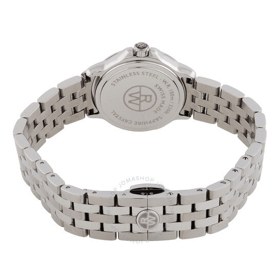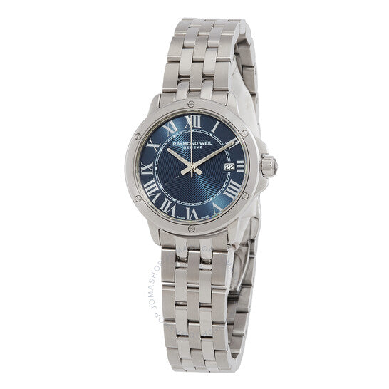 علبة وسوار من الفولاذ المقاوم للصدأ فضي اللون. إطار ثابت من الفولاذ المقاوم للصدأ فضي اللون. ميناء أزرق بعقارب فضية اللون وعلامات ساعات رومانية. علامات دقائق حول الحلقة الداخلية. نوع الميناء: تناظري. عرض التاريخ عند موضع الساعة 3. آلية حركة كوارتز. زجاج ياقوتي مقاوم للخدش. تاج قابل للسحب/الدفع. غطاء خلفي صلب. شكل العلبة دائري، مقاسها: 28 مم، سمكها: 6.6 مم. مشبك قابل للطي. مقاومة للماء حتى عمق 30 مترًا / 100 قدم. الوظائف: التاريخ، الساعة، الدقائق، الثواني. سلسلة تانجو. تصميم كاجوال. علامة الساعة: صناعة سويسرية. ساعة ريموند ويل تانجو كوارتز نسائية بمينا زرقاء، رقمها 5391-ST-00508.