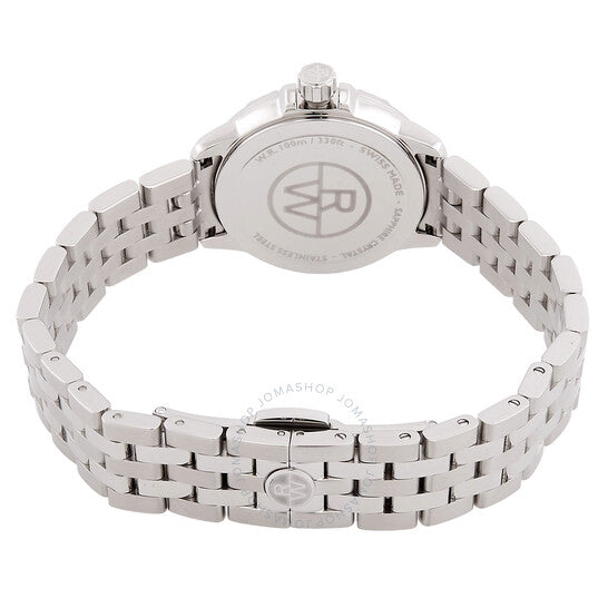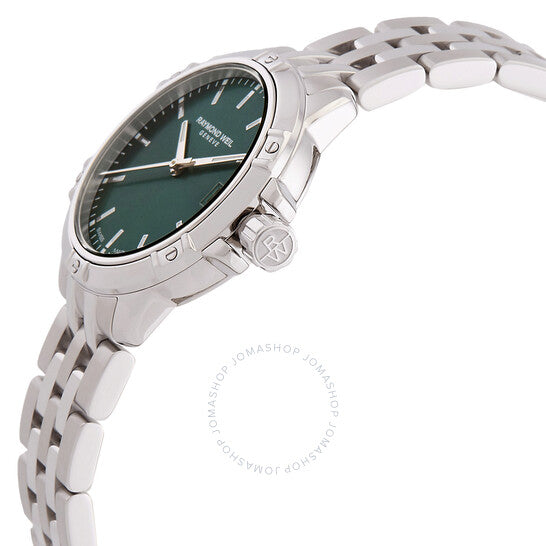 علبة وسوار من الفولاذ المقاوم للصدأ فضي اللون. إطار ثابت من الفولاذ المقاوم للصدأ فضي اللون. ميناء أخضر مع عقارب وعلامات ساعات فضية اللون. علامات دقائق حول الحافة الخارجية. نوع الميناء: تناظري. عقارب وعلامات مضيئة. عرض التاريخ عند موضع الساعة 3. آلية حركة كوارتز. زجاج ياقوتي مقاوم للخدش. تاج لولبي. غطاء خلفي صلب. شكل العلبة دائري، مقاسها: 30 مم، سمكها: 7.35 مم. مشبك قابل للطي مع مفتاح أمان. مقاومة للماء حتى عمق 100 متر / 330 قدمًا. الوظائف: التاريخ، الساعة، الدقائق، الثواني. سلسلة تانجو. تصميم ساعة كاجوال. علامة الساعة: صناعة سويسرية. ساعة ريموند ويل تانجو كوارتز نسائية بمينا خضراء، رقمها 5960-ST-52051.