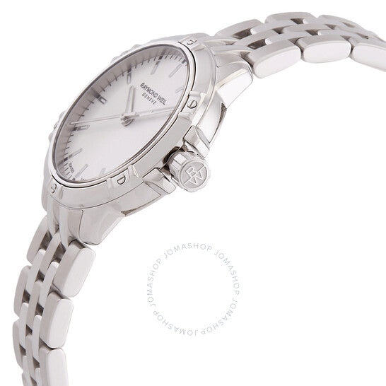 علبة وسوار من الفولاذ المقاوم للصدأ فضي اللون. إطار ثابت من الفولاذ المقاوم للصدأ فضي اللون. ميناء أبيض بنقش أشعة الشمس مع عقارب وعلامات ساعات فضية اللون. علامات دقائق حول الحافة الخارجية. نوع الميناء: تناظري. عقارب وعلامات مضيئة. عرض التاريخ عند موضع الساعة 3. آلية حركة كوارتز. زجاج ياقوتي مقاوم للخدش. تاج لولبي. غطاء خلفي صلب. شكل العلبة دائري، مقاسها: 30 مم، سمكها: 7.35 مم. مشبك قابل للطي مع مفتاح أمان. مقاومة للماء حتى عمق 100 متر / 330 قدمًا. الوظائف: التاريخ، الساعة، الدقائق، الثواني. سلسلة تانجو. تصميم كاجوال. علامة الساعة: صناعة سويسرية. ساعة ريموند ويل تانجو كوارتز نسائية 5960-ST-30041.