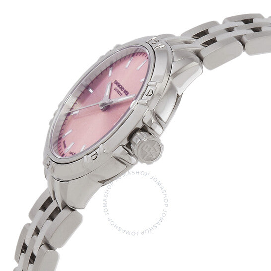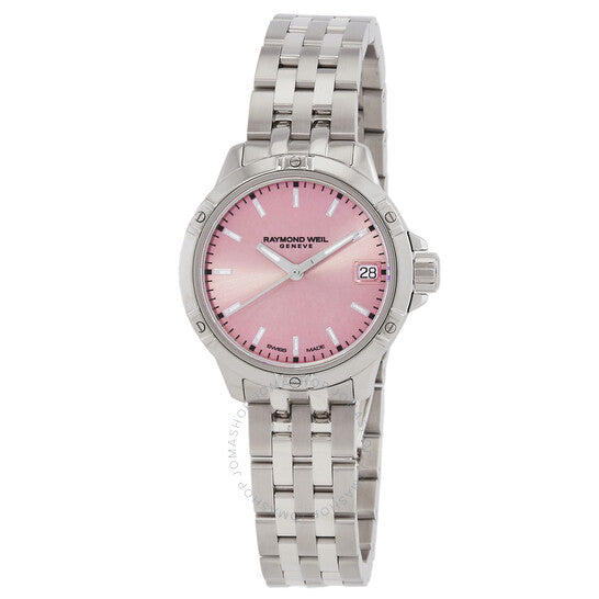علبة وسوار من الفولاذ المقاوم للصدأ فضي اللون. إطار ثابت من الفولاذ المقاوم للصدأ فضي اللون. ميناء وردي مع عقارب وعلامات ساعات فضية اللون. علامات دقائق حول الحافة الخارجية. نوع الميناء: تناظري. عقارب وعلامات مضيئة. عرض التاريخ عند موضع الساعة 3. حركة كوارتز. زجاج ياقوتي مقاوم للخدش. شكل العلبة دائري، مقاسها: 30 مم. مشبك قابل للطي مع قفل أمان. الوظائف: التاريخ، الساعة، الدقائق، الثواني. سلسلة تانجو. تصميم ساعة كاجوال. علامة الساعة: صناعة سويسرية. ساعة ريموند ويل تانجو كوارتز نسائية بمينا وردي، رقمها 5960-ST-80001.