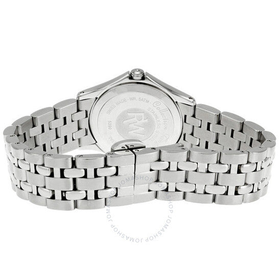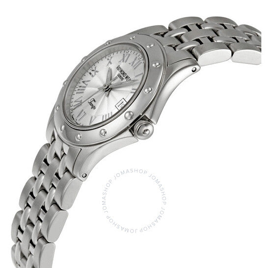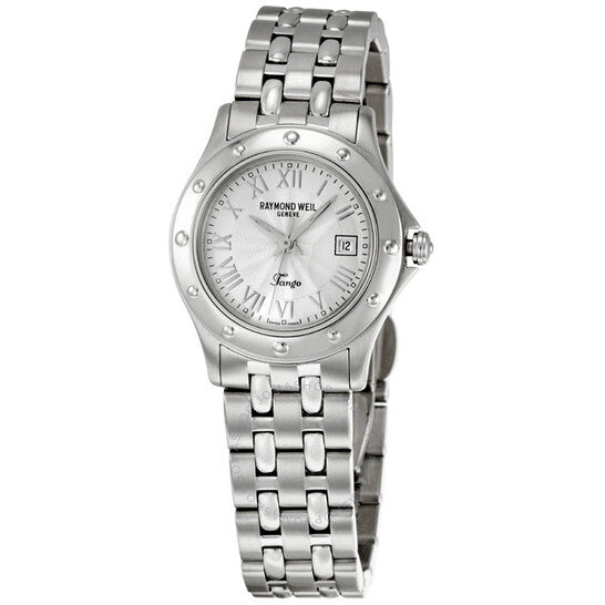 علبة من الفولاذ المقاوم للصدأ مع سوار من الفولاذ المقاوم للصدأ. إطار ثابت من الفولاذ المقاوم للصدأ. ميناء فضي اللون بعقارب فضية اللون وعلامات ساعات بأرقام رومانية. علامات دقائق حول الحافة الخارجية. يظهر عرض التاريخ عند موضع الساعة 3. حركة كوارتز سويسرية. كريستال ياقوتي مقاوم للخدش. غطاء خلفي صلب. قطر العلبة: 28 مم. مشبك قابل للطي بزر ضغط. مقاومة للماء حتى عمق 50 مترًا / 165 قدمًا. ساعة ريموند ويل تانجو نسائية بمينا فضي 5390-ST-00658.