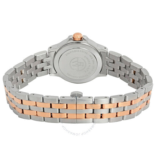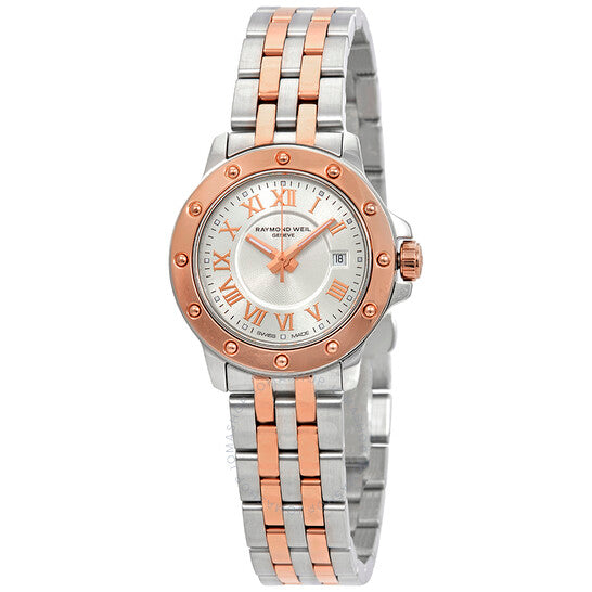 علبة من الفولاذ المقاوم للصدأ مع سوار من الفولاذ المقاوم للصدأ ثنائي اللون (فضي وذهبي وردي مطلي بتقنية PVD). إطار ثابت من الذهب الوردي مطلي بتقنية PVD. ميناء فضي مع عقارب مضيئة من الذهب الوردي وعلامات ساعات رومانية. علامات دقائق حول الحافة الخارجية. نوع الميناء: تناظري. عقارب مضيئة. عرض التاريخ عند موضع الساعة 3. حركة كوارتز. زجاج ياقوت مقاوم للخدش. تاج قابل للسحب/الدفع. غطاء خلفي صلب. شكل دائري. حجم العلبة: 28 مم. سمك العلبة: 8 مم. عرض السوار: 14 مم. طول السوار: 7.5 بوصة. مشبك قابل للطي بزر ضغط. مقاومة للماء حتى عمق 50 مترًا / 165 قدمًا. الوظائف: التاريخ، الساعة، الدقيقة، الثانية. معلومات إضافية: مناسبة بشكل عام للسباحة والغطس، ولكنها ليست مناسبة للغوص. طراز ساعة رسمية. علامة الساعة: صناعة سويسرية. ساعة ريموند ويل تانجو نسائية بمينا فضي 5399-SB5-00658.
