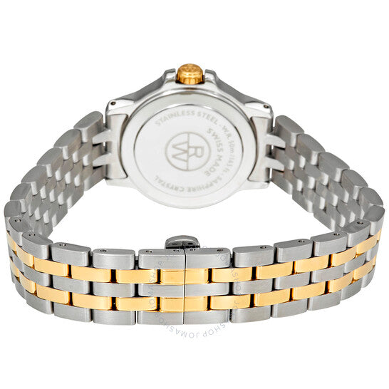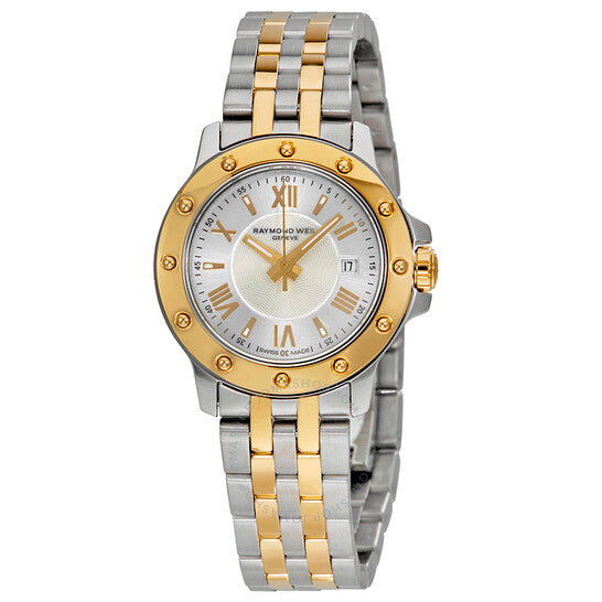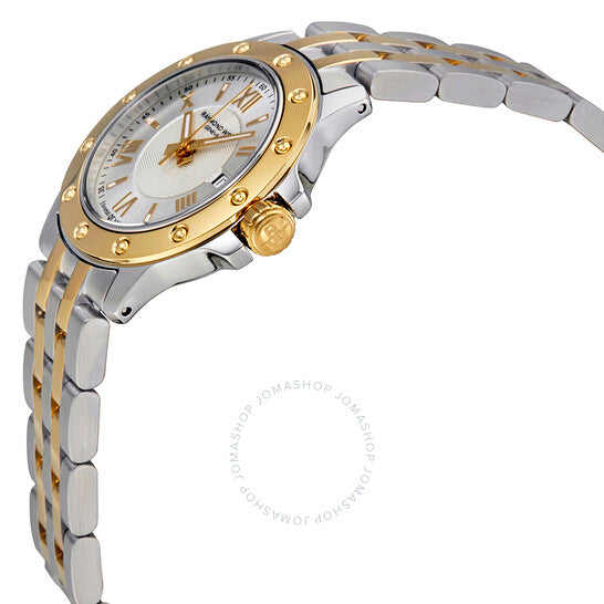 علبة من الفولاذ المقاوم للصدأ مع سوار من الفولاذ المقاوم للصدأ بوصلات مطلية بالذهب عيار ١٨ قيراطًا. إطار ثابت مطلي بالذهب الأصفر عيار ١٨ قيراطًا. ميناء فضي مع عقارب مضيئة بلون الذهب الأصفر وعلامات ساعات رومانية. علامات دقائق حول الحافة الخارجية. نوع الميناء: تناظري. عقارب وعلامات مضيئة. عرض التاريخ عند موضع الساعة ٣. حركة كوارتز. زجاج من الياقوت المقاوم للخدش. غطاء خلفي صلب. حجم العلبة: ٢٨ مم. سُمكها: ٧ مم. شكلها دائري. عرض السوار: ١٤ مم. طول السوار: ٧ بوصات. مشبك قابل للطي. مقاومة للماء حتى عمق ٥٠ مترًا / ١٦٥ قدمًا. الوظائف: التاريخ، الساعة، الدقيقة، الثانية. تصميم كاجوال. علامة الساعة: صناعة سويسرية. إصدارات الساعة: ٥٣٩٩ STP ٠٠٦٥٧، ٥٣٩٩.STP.٠٠٦٥٧، ٥٣٩٩STP٠٠٦٥٧. ساعة ريموند ويل تانجو للسيدات بمينا فضي 5399-STP-00657.
