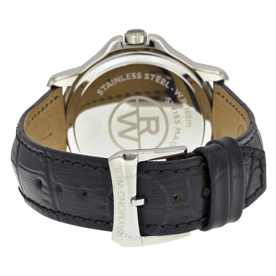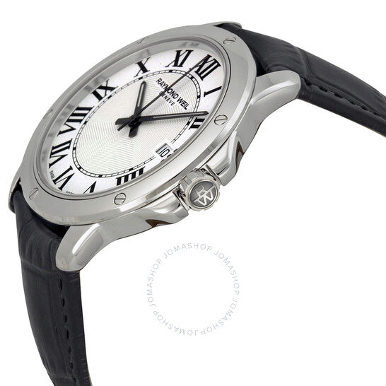 علبة من الفولاذ المقاوم للصدأ مع سوار جلدي أسود. إطار ثابت من الفولاذ المقاوم للصدأ. ميناء أبيض بعقارب فضية مضيئة وعلامات ساعات رومانية. علامات دقائق حول حلقة داخلية. نوع الميناء: تناظري. عقارب وعلامات مضيئة. عرض التاريخ عند موضع الساعة 3. آلية حركة كوارتز. زجاج ياقوتي مقاوم للخدش. تاج قابل للسحب/الدفع. غطاء خلفي صلب. قطر العلبة: 39 مم. سمكها: 8 مم. شكلها دائري. عرض السوار: 20 مم. طول السوار: 8.5 بوصة. مشبك تانغ. مقاومة للماء حتى عمق 100 متر / 330 قدمًا. الوظائف: التاريخ، الساعة، الدقائق، الثواني. تصميم كاجوال. علامة الساعة: صناعة سويسرية. ساعة ريموند ويل تانجو للرجال، جلد أبيض أسود، 5591-L1-00300.