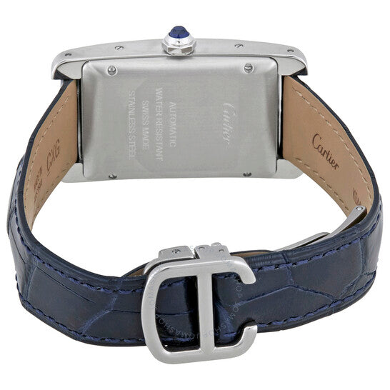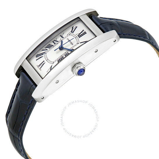 علبة من الفولاذ المقاوم للصدأ مع سوار من جلد التمساح أزرق داكن. إطار ثابت من الفولاذ المقاوم للصدأ. ميناء فضي بعقارب على شكل سيف من الفولاذ المزرق، وعلامات ساعات رومانية سوداء. علامات دقائق حول حلقة داخلية. نوع الميناء: تناظري. حركة أوتوماتيكية. زجاج ياقوت مقاوم للخدش. مثمن الشكل مع تاج من الإسبنيل الأزرق الصناعي. غطاء خلفي صلب. شكل العلبة مستطيل. أبعاد العلبة: 41.6 مم × 22.6 مم. سمك العلبة: 9.5 مم. عرض السوار: 14 مم. مشبك قابل للطي. مقاومة للماء حتى عمق 30 مترًا / 100 قدم. الوظائف: الساعات، الدقائق، الثواني. سلسلة تانك أمريكاين. تصميم ساعة فاخرة. علامة الساعة: صناعة سويسرية. ساعة كارتييه تانك أمريكاين أوتوماتيكية نسائية بمينا فضي WSTA0017.