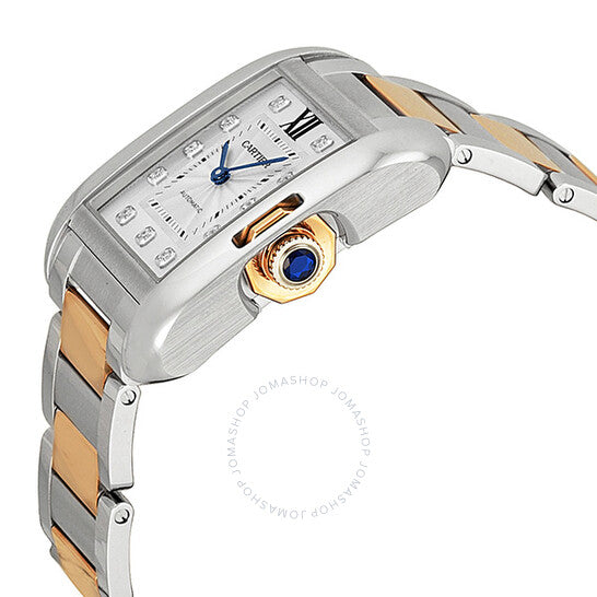 علبة من الفولاذ المقاوم للصدأ مع سوار من الفولاذ المقاوم للصدأ بوصلات من الذهب الوردي عيار 18 قيراطًا. إطار ثابت من الفولاذ المقاوم للصدأ. ميناء فضي مع عقارب على شكل سيف من الفولاذ المزرق وعلامات ساعات من الماس. يظهر رقم روماني عند موضع الساعة 12. علامات الدقائق حول حلقة داخلية. نوع الميناء: تناظري. حركة كارتييه عيار 076 أوتوماتيكية، مبنية على ETA 2670، تحتوي على 25 جوهرة، تنبض بمعدل 28800 ذبذبة في الساعة، ولديها احتياطي طاقة لمدة 38 ساعة تقريبًا. كريستال ياقوت مقاوم للخدش. تاج من الذهب الوردي عيار 18 قيراطًا مرصع بحجر كابوشون من الإسبنيل الصناعي. غطاء خلفي لولبي. شكل العلبة مستطيل. أبعاد العلبة: 39 مم × 29.8 مم. سمك العلبة: 9.5 مم. عرض السوار: 20.3 مم، طول السوار: 8 بوصات. مشبك طي مخفي. مقاومة للماء حتى عمق 30 مترًا / 100 قدم. الوظائف: الساعة، الدقائق. سلسلة تانك أنجليز. ساعة فاخرة. صناعة سويسرية. ساعة كارتييه تانك أنجليز أوتوماتيكية بمينا فضي للنساء WT100025.