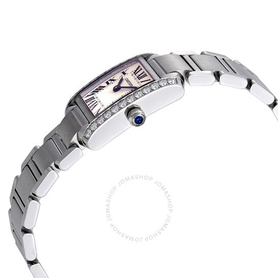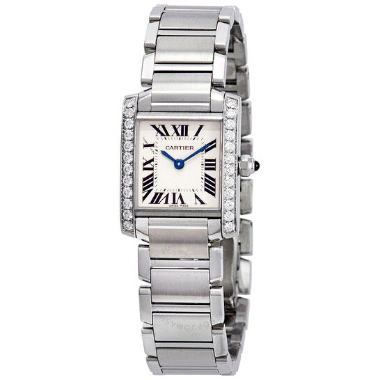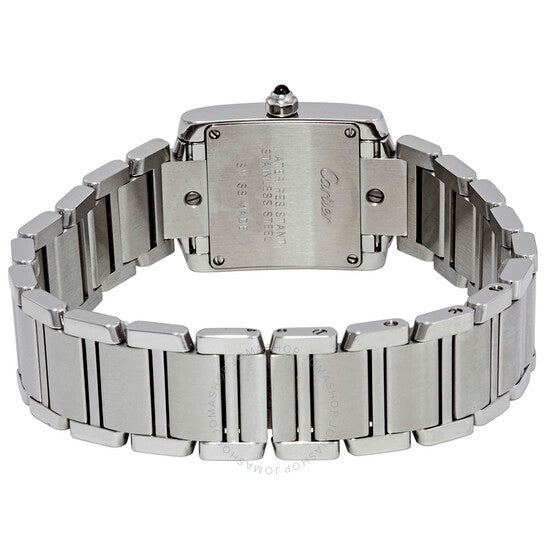 علبة من الفولاذ المقاوم للصدأ مع سوار من الفولاذ المقاوم للصدأ. إطار ثابت من الفولاذ المقاوم للصدأ مرصع بـ ٢٤ ماسة. ميناء فضي بعقارب زرقاء وعلامات ساعات رومانية. علامات دقائق حول حلقة داخلية. نوع الميناء: تناظري. حركة كوارتز كارتييه عيار ١٩٠٤ ٢TZ MC. زجاج ياقوت مقاوم للخدش. تاج قابل للسحب/الدفع. غطاء خلفي صلب. شكل العلبة مربع. أبعاد العلبة: ٢٠ مم × ٢٥ مم. سمكها: ٦ مم. مشبك قابل للطي. مقاومة للماء حتى عمق ٣٠ مترًا / ١٠٠ قدم. الوظائف: الساعات، الدقائق. معلومات إضافية: إطار مرصع بـ ٢٤ ماسة (٠.٤٩ قيراط). تصميم ساعة فاخرة. علامة الساعة: صناعة سويسرية. ساعة كارتييه تانك فرانسيز نسائية بمينا فضي W4TA0008.