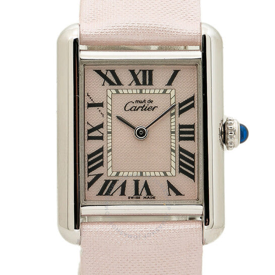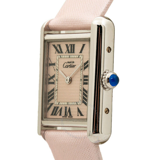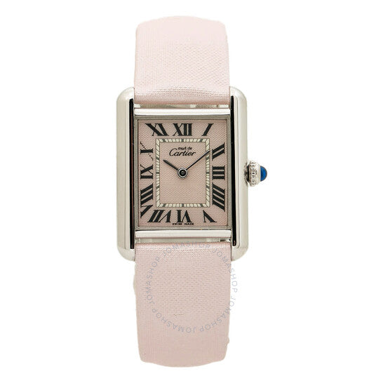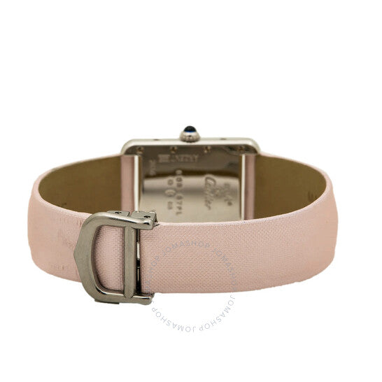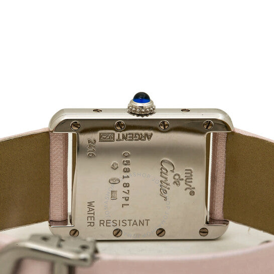 علبة فضية اللون مع سوار ساتان وردي. إطار ثابت من الفضة الإسترليني عيار 925 بلون فضي. ميناء وردي بأرقام رومانية. نوع الميناء: تناظري. حركة كوارتز. زجاج ياقوت مقاوم للخدش. تاج قابل للسحب/الدفع. غطاء خلفي صلب. شكل العلبة مستطيل، مقاسها: 22 مم، سمكها: 6 مم. عرض السوار: 16 مم، طوله: 6 بوصات. مشبك قابل للطي. الوظائف: الساعات، الدقائق. سلسلة تانك. طراز ساعة فاخرة. علامة الساعة: صناعة سويسرية. ساعة كارتييه تانك كوارتز نسائية بمينا وردي، 2416.
