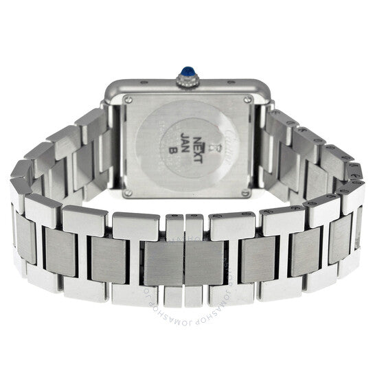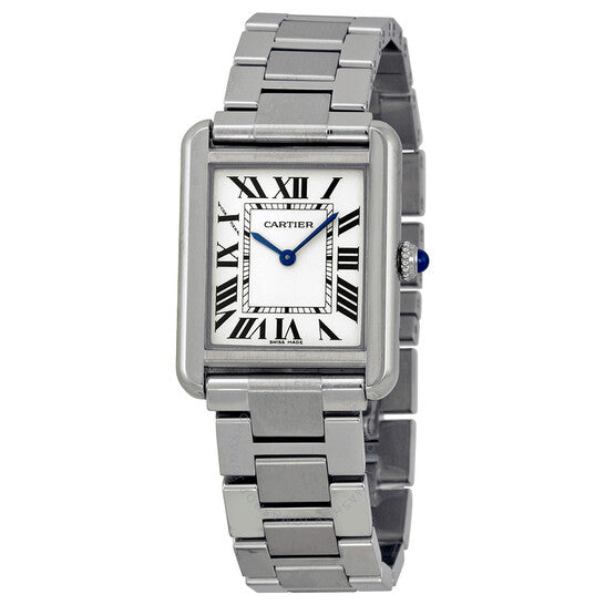 علبة من الفولاذ المقاوم للصدأ مع سوار من الفولاذ المقاوم للصدأ. إطار ثابت من الفولاذ المقاوم للصدأ. ميناء فضي مُعقّم بعقارب زرقاء على شكل سيف وعلامات ساعات رومانية سوداء. علامات دقائق حول الحلقة الداخلية. نوع الميناء: تناظري. عقارب وعلامات ميناء مضيئة. حركة كوارتز. زجاج ياقوت مقاوم للخدش. تاج قابل للسحب/الدفع. غطاء خلفي صلب. أبعاد العلبة: ٣١ مم × ٢٤ مم. سُمك العلبة: ٥.٥٥ مم. شكل العلبة مربع. عرض السوار: ١٦ مم. مشبك قابل للطي. مقاومة للماء حتى عمق ٣٠ مترًا / ١٠٠ قدم. الوظائف: الساعات، الدقائق. تصميم ساعة فاخرة. علامة الساعة: صناعة سويسرية. ساعة كارتييه تانك سولو صغيرة W5200013.