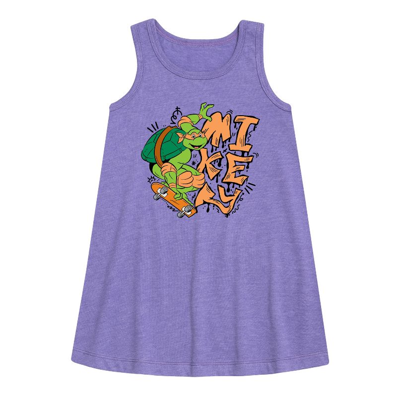 سلاحف النينجا المراهقة المتحولة - مايكي - فستان بقصة A للفتيات الصغيرات والشابات - أطلق العنان لبطلك الكامن مع ملابس سلاحف النينجا المراهقة المتحولة، التي تتميز بتصاميم جريئة وملونة لأبطالها الأسطوريين في نصف صدفة: ليوناردو، دوناتيلو، رافائيل، ومايكل أنجلو. هذه المجموعة مثالية لجميع الأعمار، وتحتفي بالمغامرات المليئة بالإثارة والأخوة وروح المرح لهؤلاء النينجا الأسطوريين الذين يسكنون المجاري.