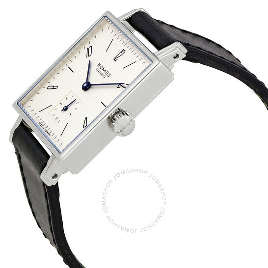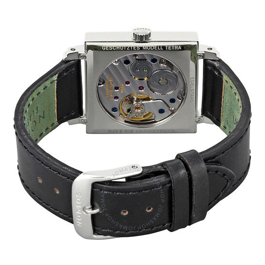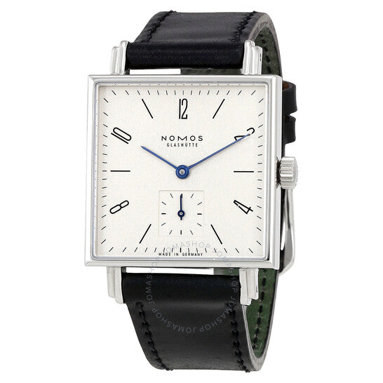 علبة من الفولاذ المقاوم للصدأ مع سوار جلدي أسود. إطار ثابت من الفولاذ المقاوم للصدأ. ميناء مجلفن مطلي بالفضة البيضاء، بعقارب فولاذية مزرقة، وأرقام عربية وعلامات ساعات متناوبة. علامات دقائق حول الحافة الخارجية. نوع الميناء: تناظري. ميناء فرعي للثواني الصغيرة عند موضع الساعة السادسة. آلية حركة يدوية. محرك ألفا من كاليبر. كريستال ياقوت مقاوم للخدش. تاج ضغط/سحب. غطاء خلفي شفاف. قطر العلبة: ٢٩.٥ مم × ٢٩.٥ مم. سُمك العلبة: ٦.١٥ مم. شكل العلبة مربع. عرض السوار: ١٨ مم. مشبك تانغ. مقاومة للماء حتى عمق ٣٠ مترًا / ١٠٠ قدم. الوظائف: الساعات، الدقائق، الثواني. معلومات إضافية: سوار جلدي مصنوع من صدفة كوردوفان. تصميم ساعة كاجوال. ملصق الساعة: صنع في ألمانيا. ساعة نوموس تيترا نسائية بمينا أبيض وجلد أسود، رقم ٤٠٦.